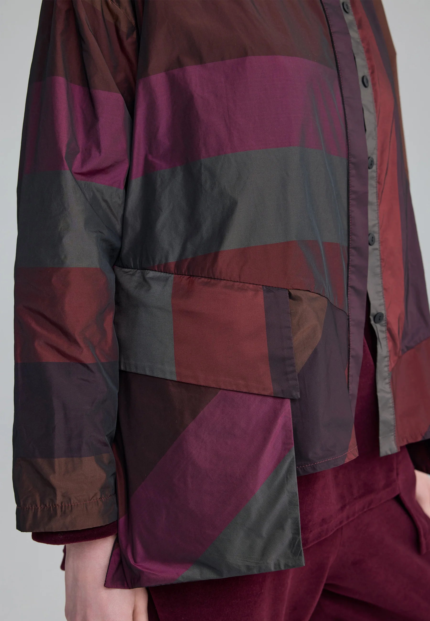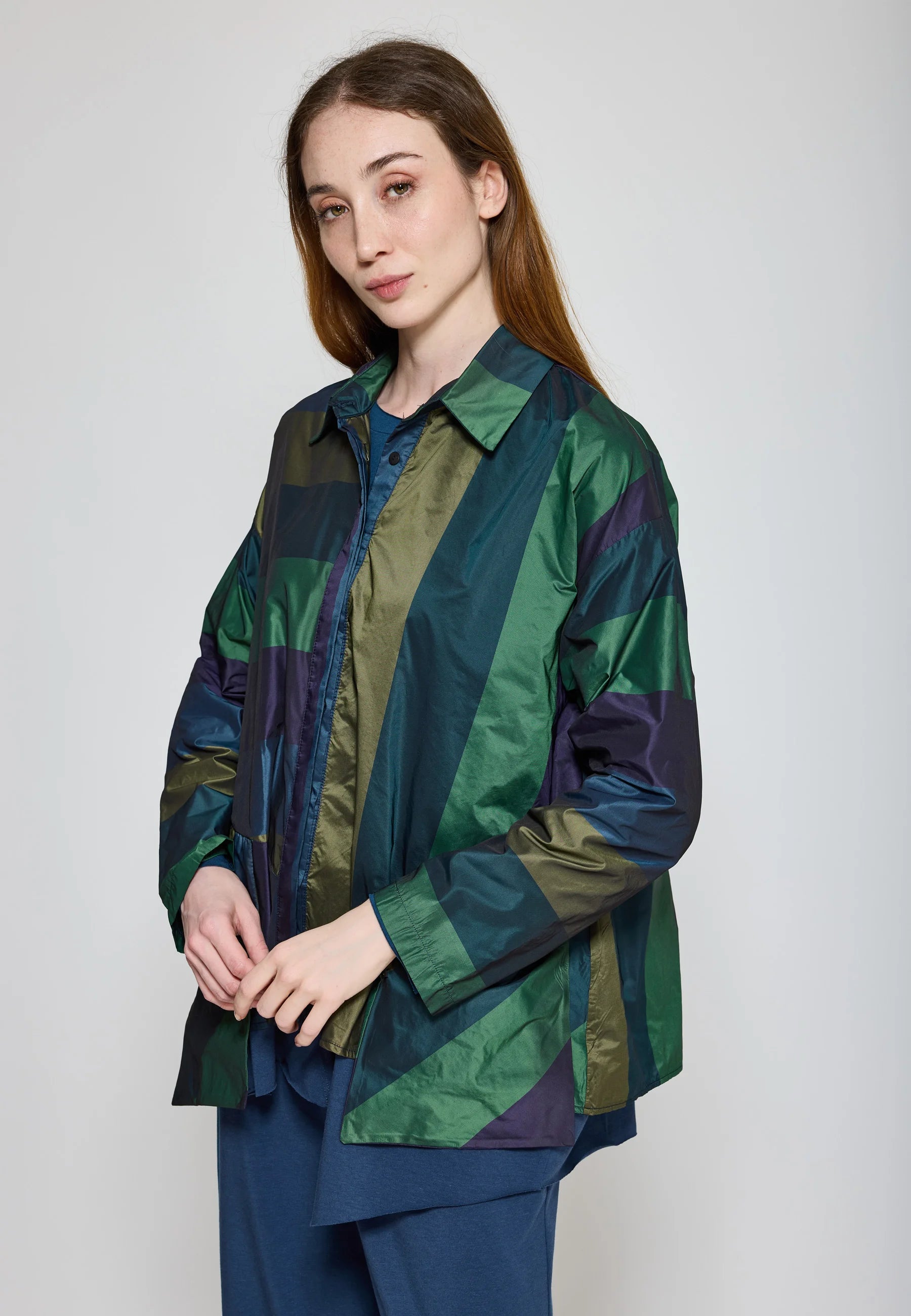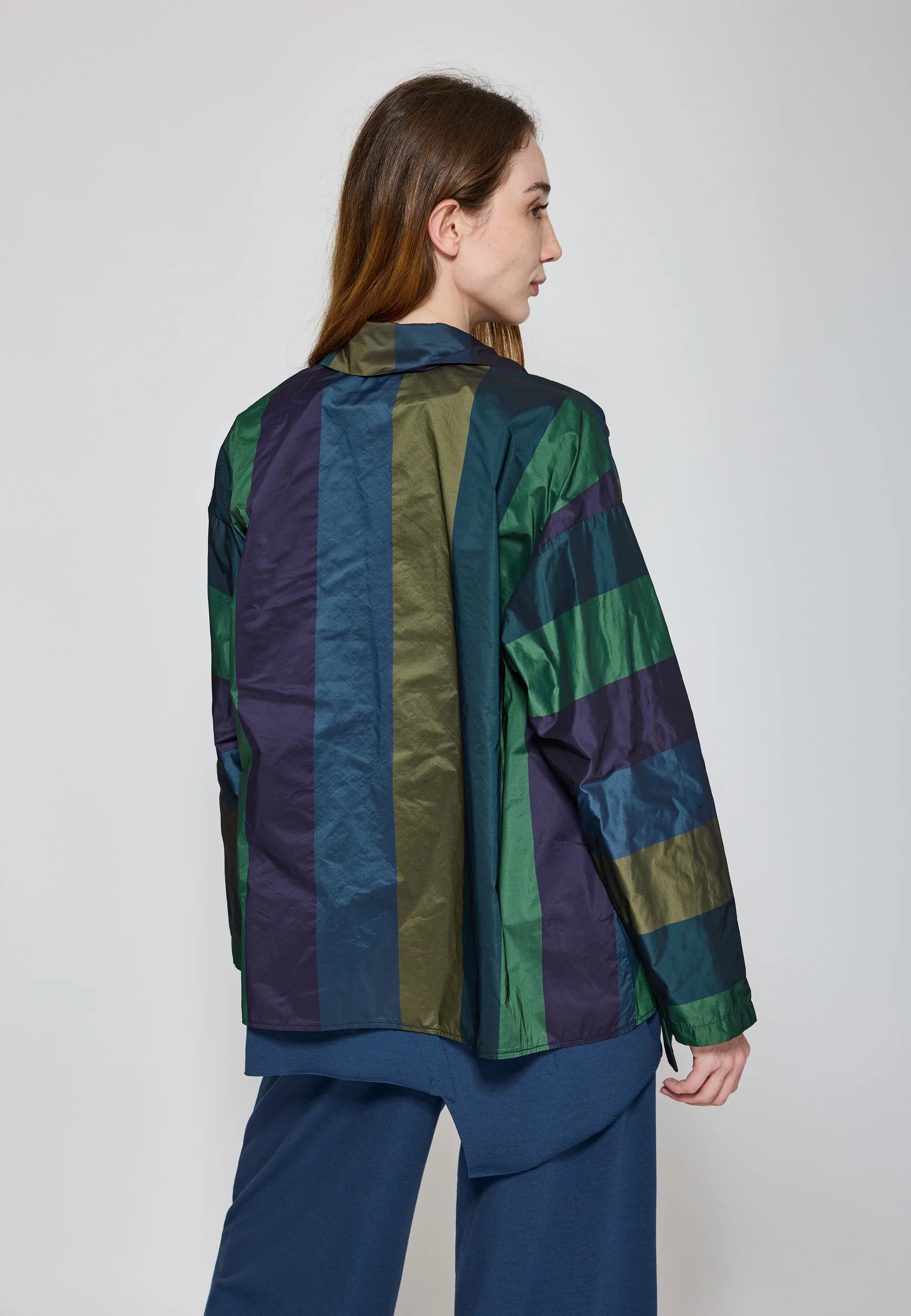 ✓ The long drop-shoulder sleeves and a unique mixed striped pattern create an artistic statement.