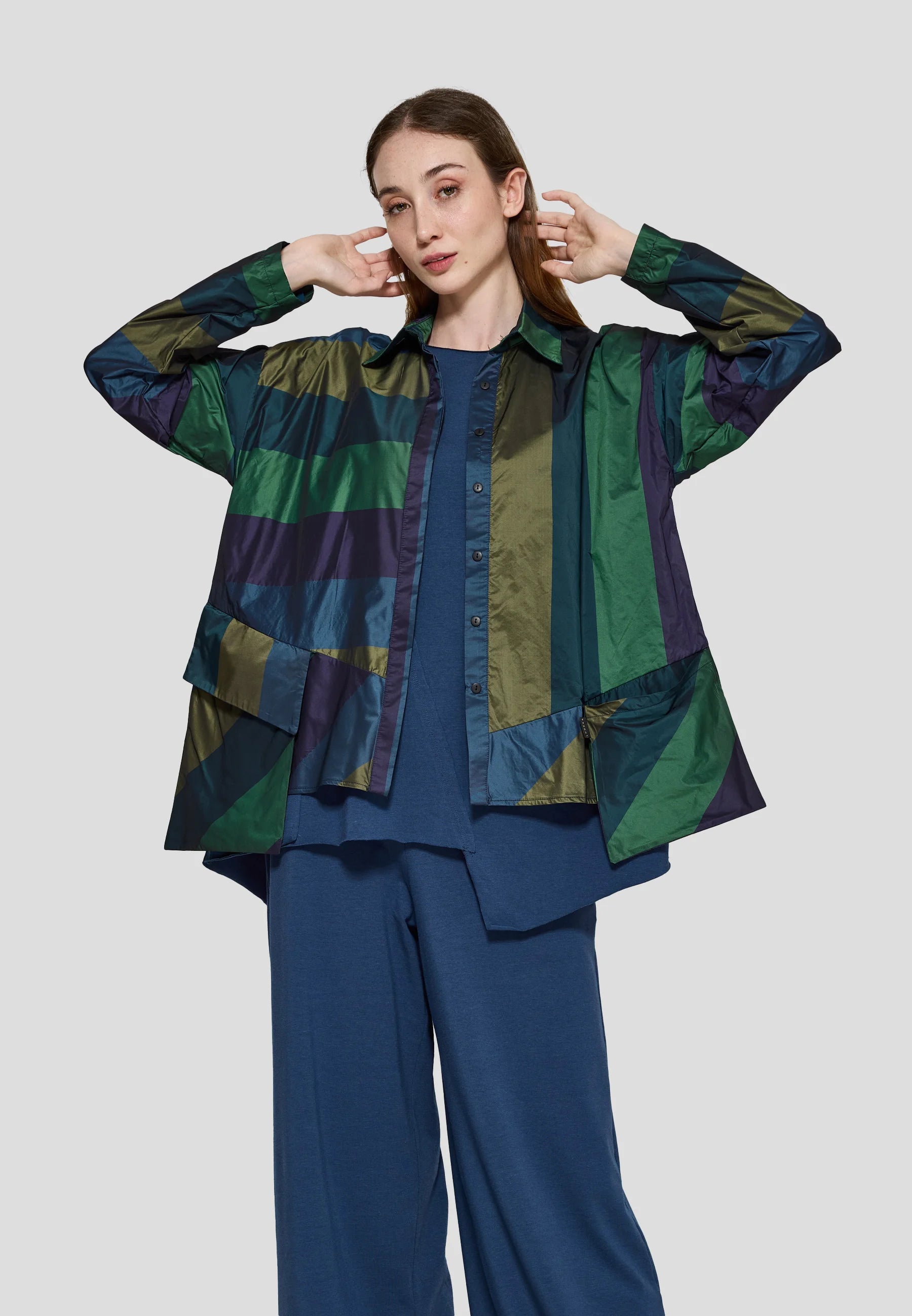 Its structured fabric and unconventional hem are beautifully highlighted when layered over the GRETA Asymmetrical blouse.