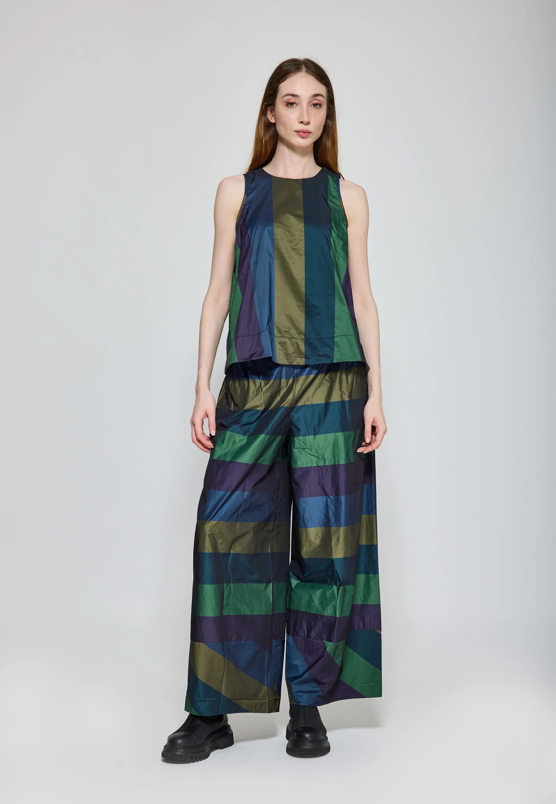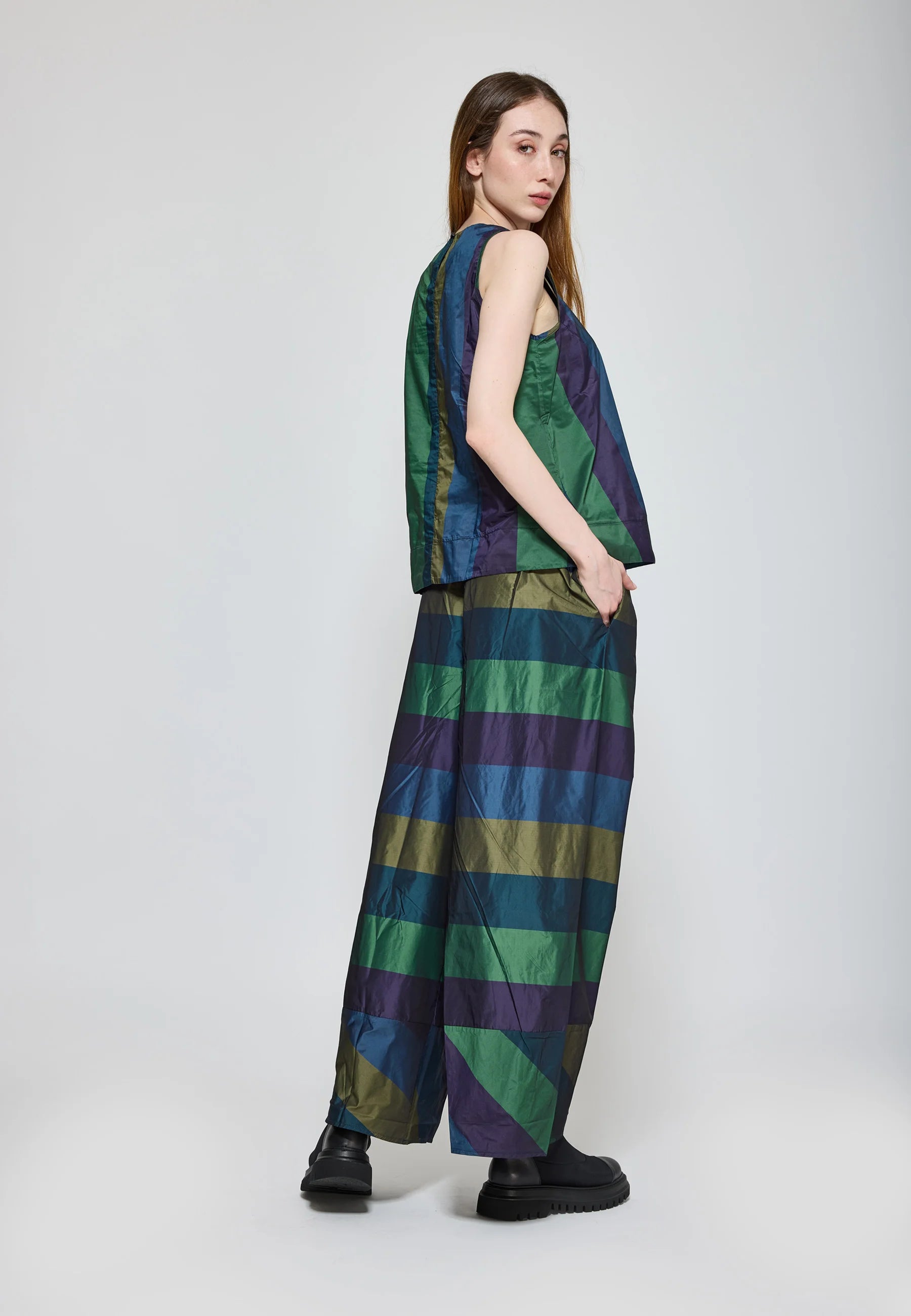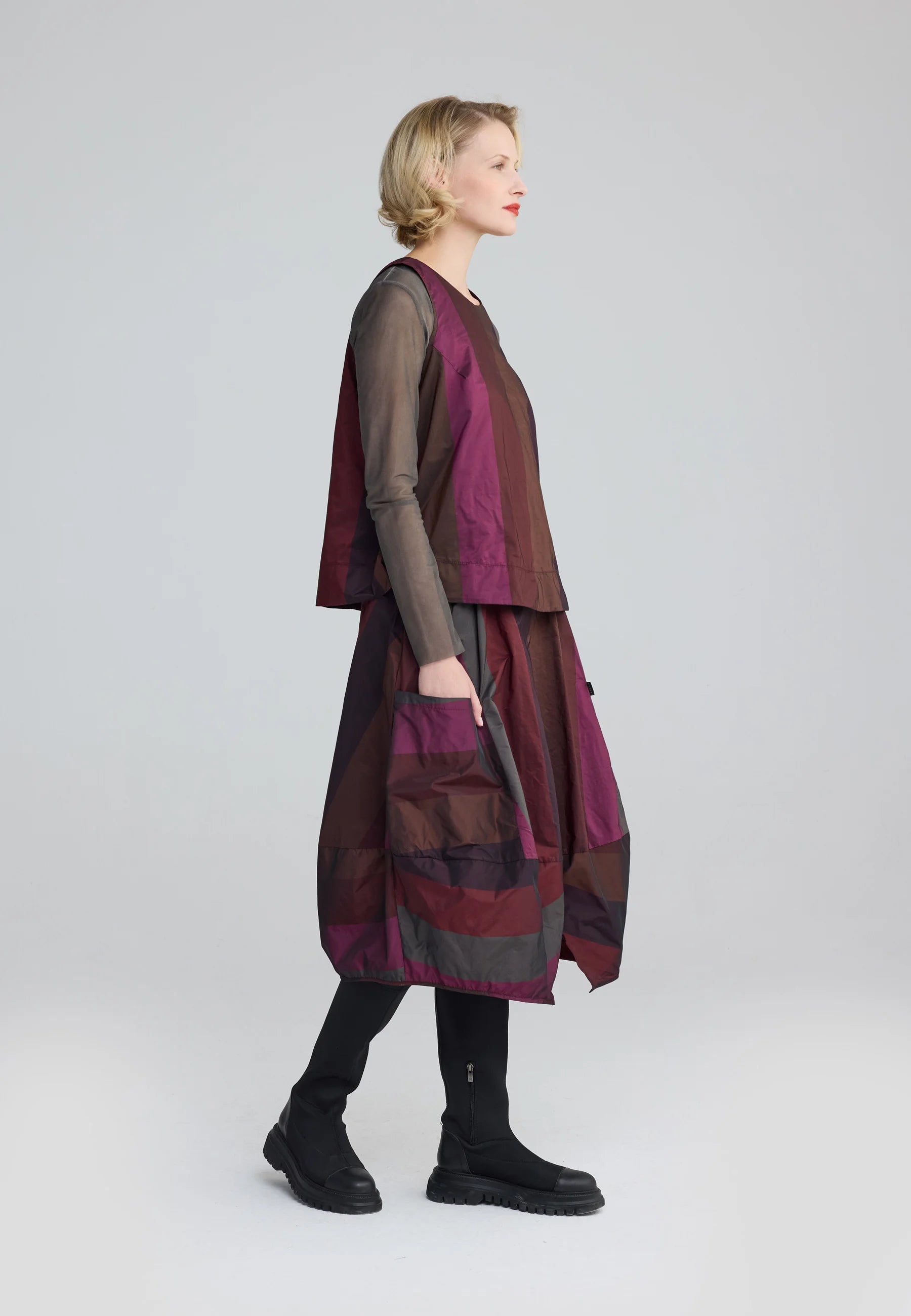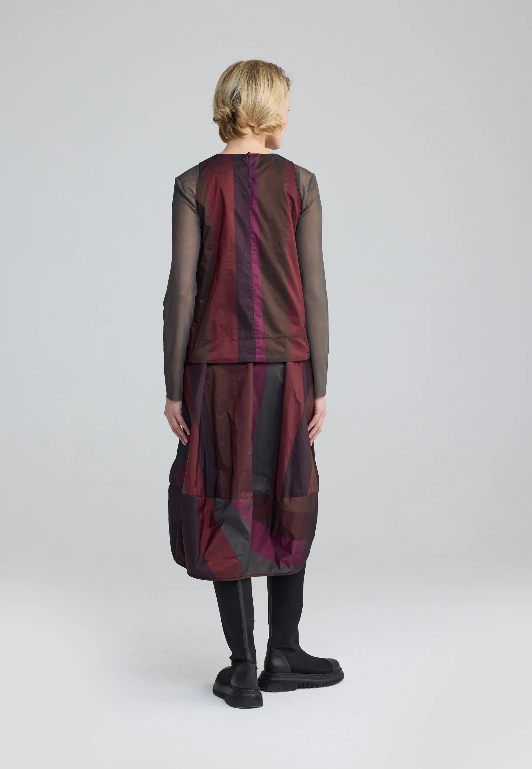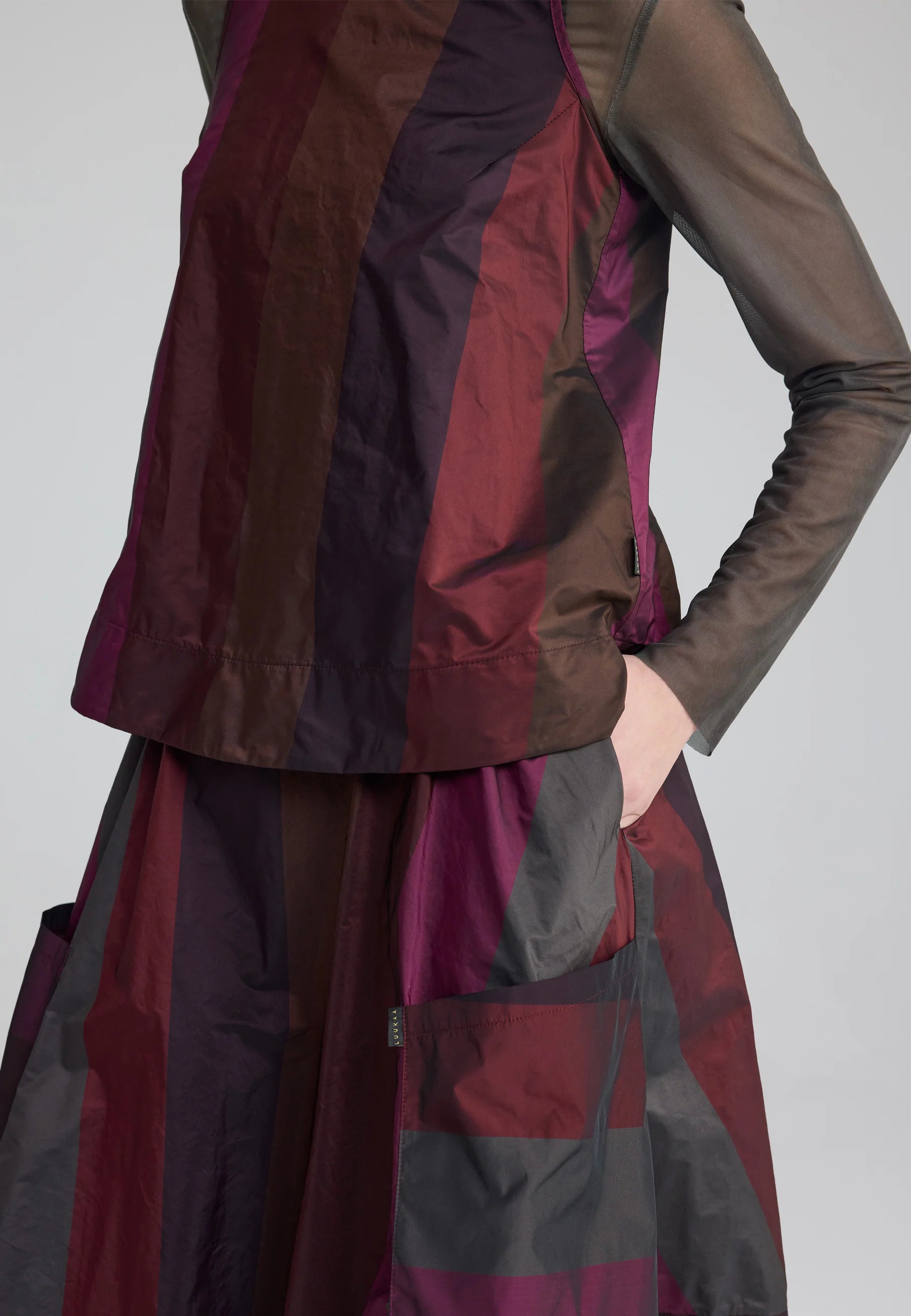 For a contemporary, layered ensemble, style it over the MARLENE Garment-dyed mesh blouse, allowing the taffeta’s structured form to contrast with the sheer, fluid fabric underneath.