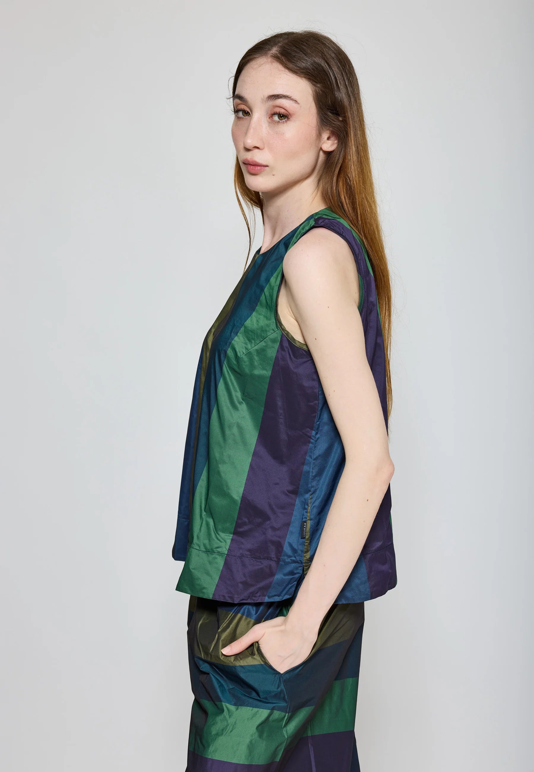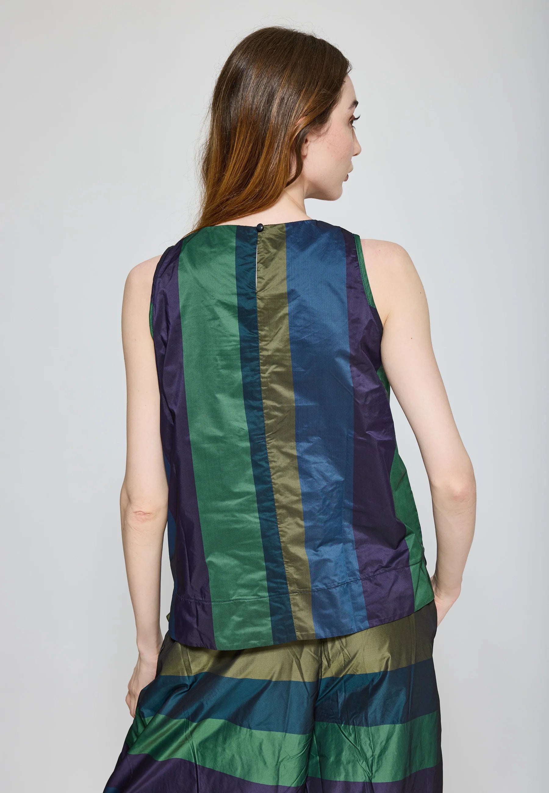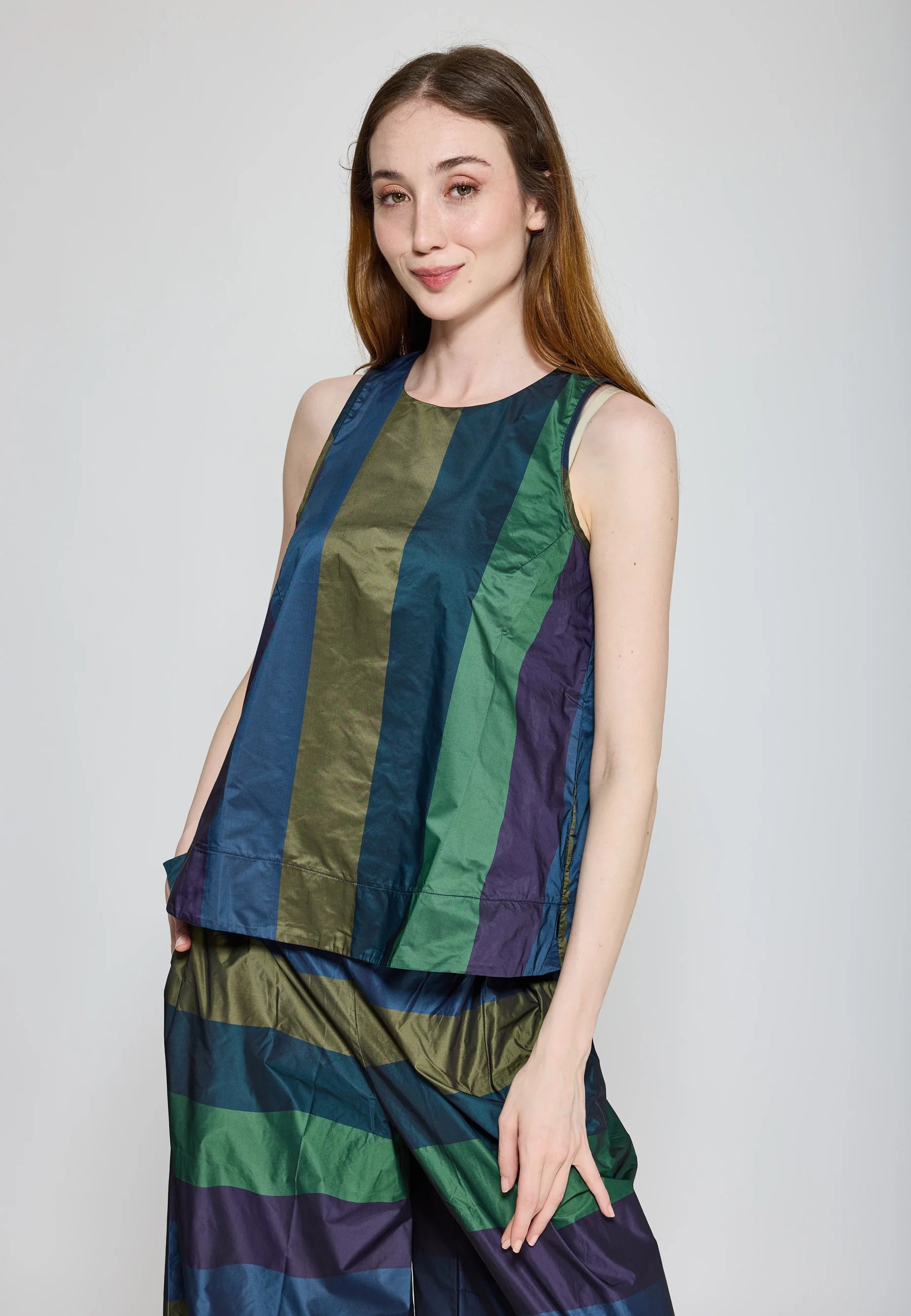 ✓ A chic and modern sleeveless top crafted from structured memory taffeta, a fabric that holds its elegant A-line silhouette beautifully.