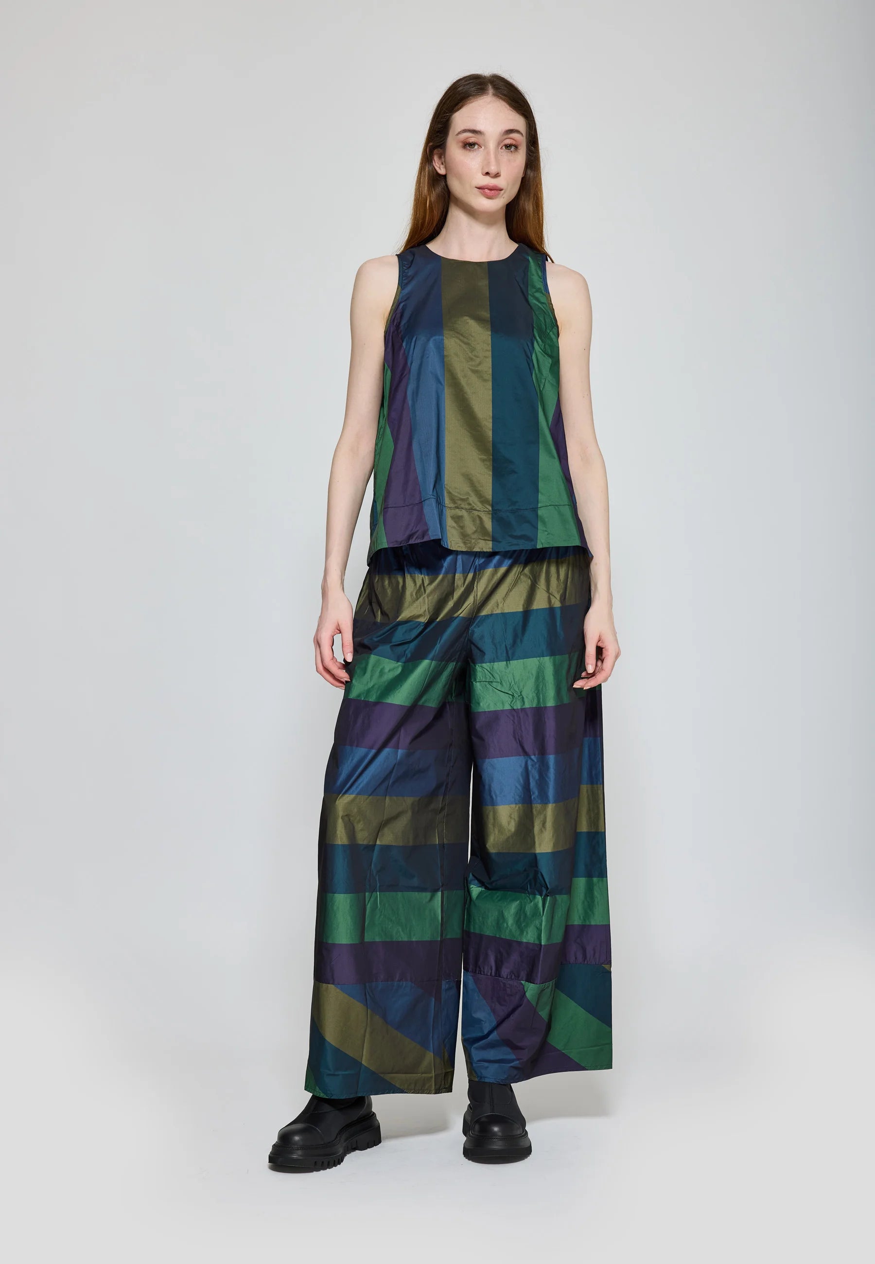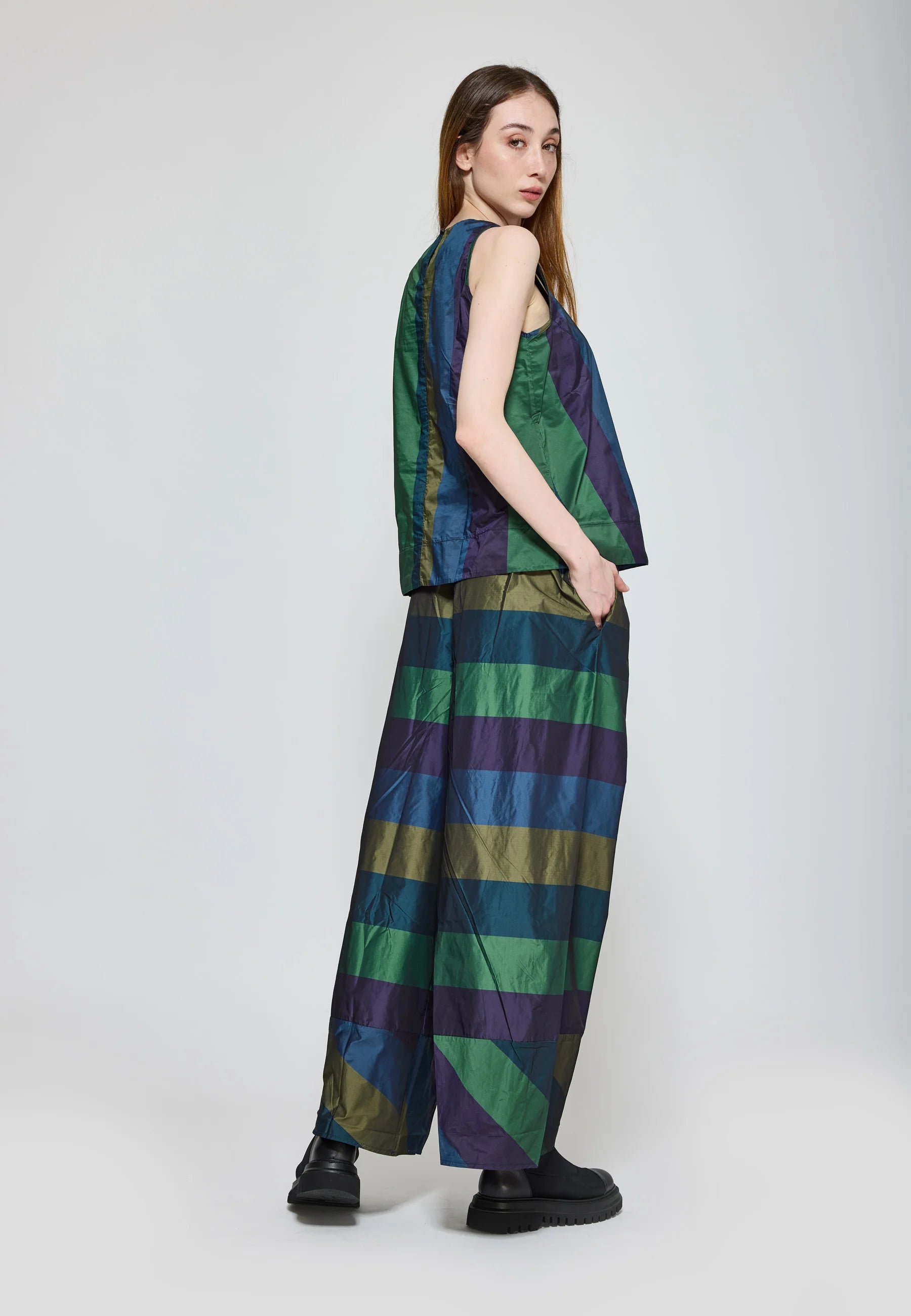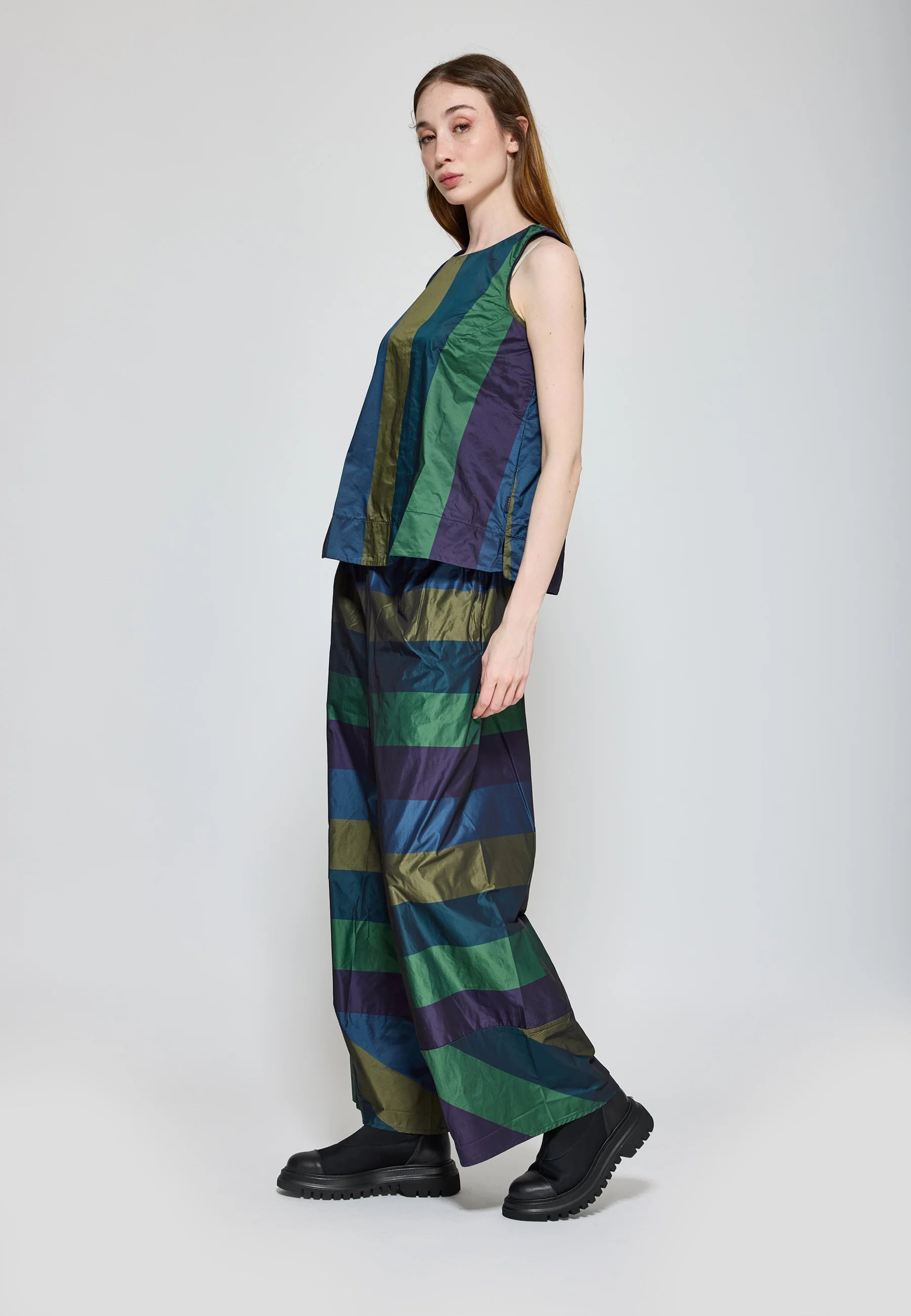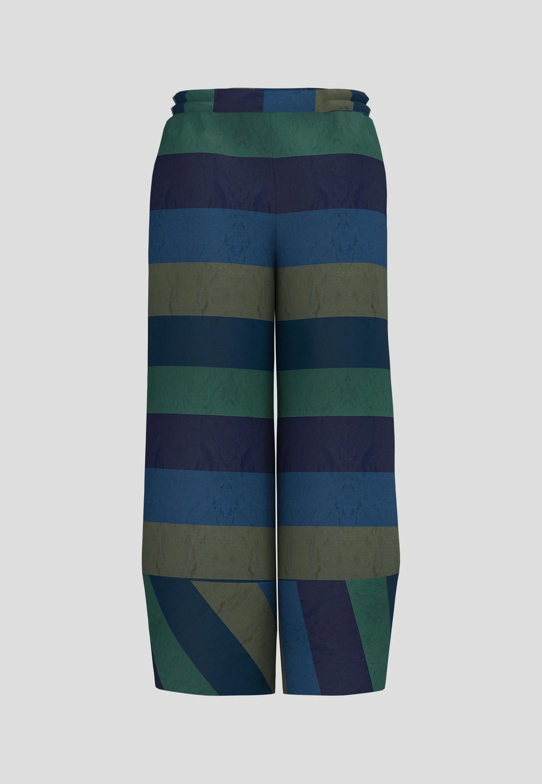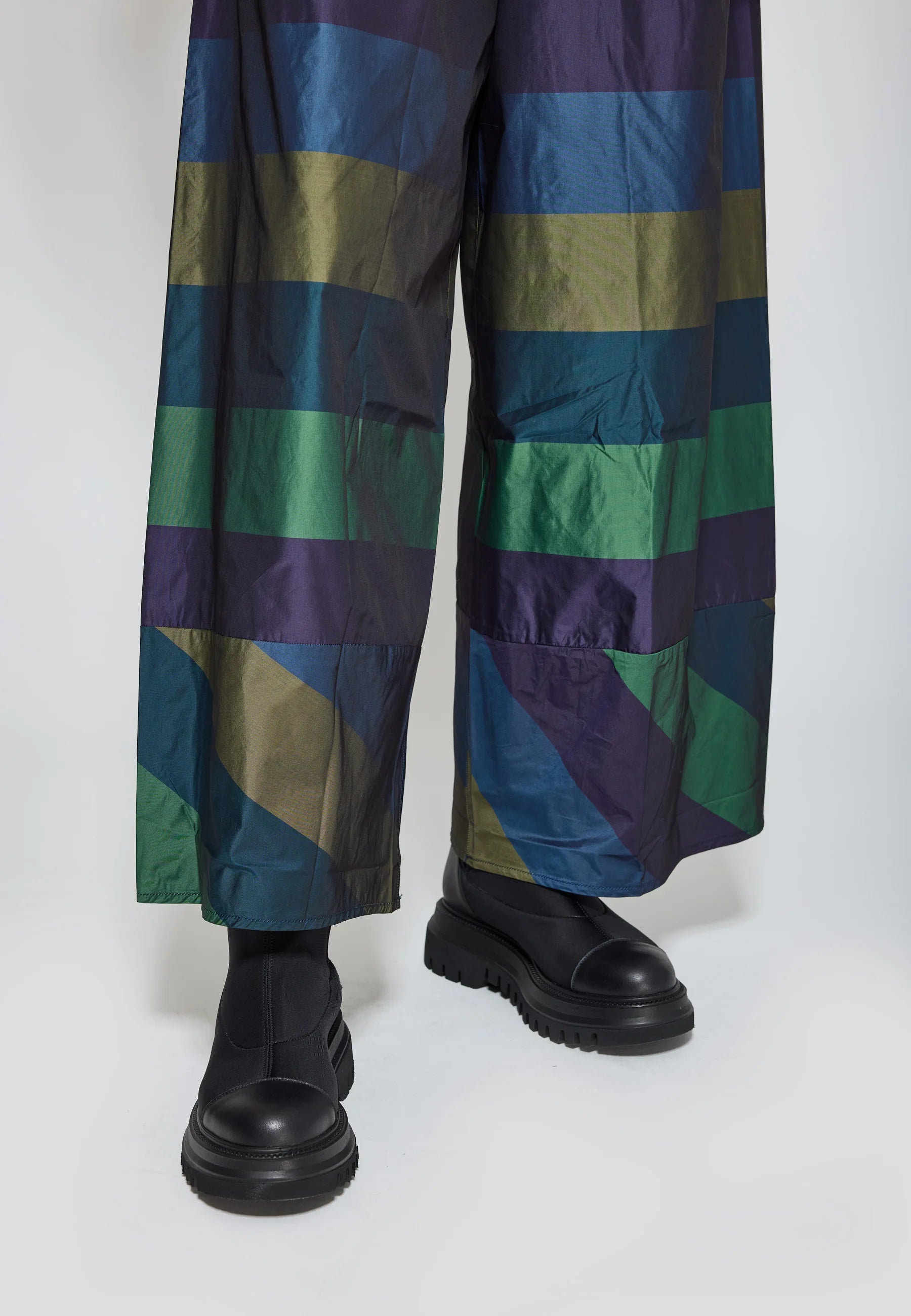 ✓ A pair of modern pants crafted from crisp memory taffeta with a bold mixed striped pattern.