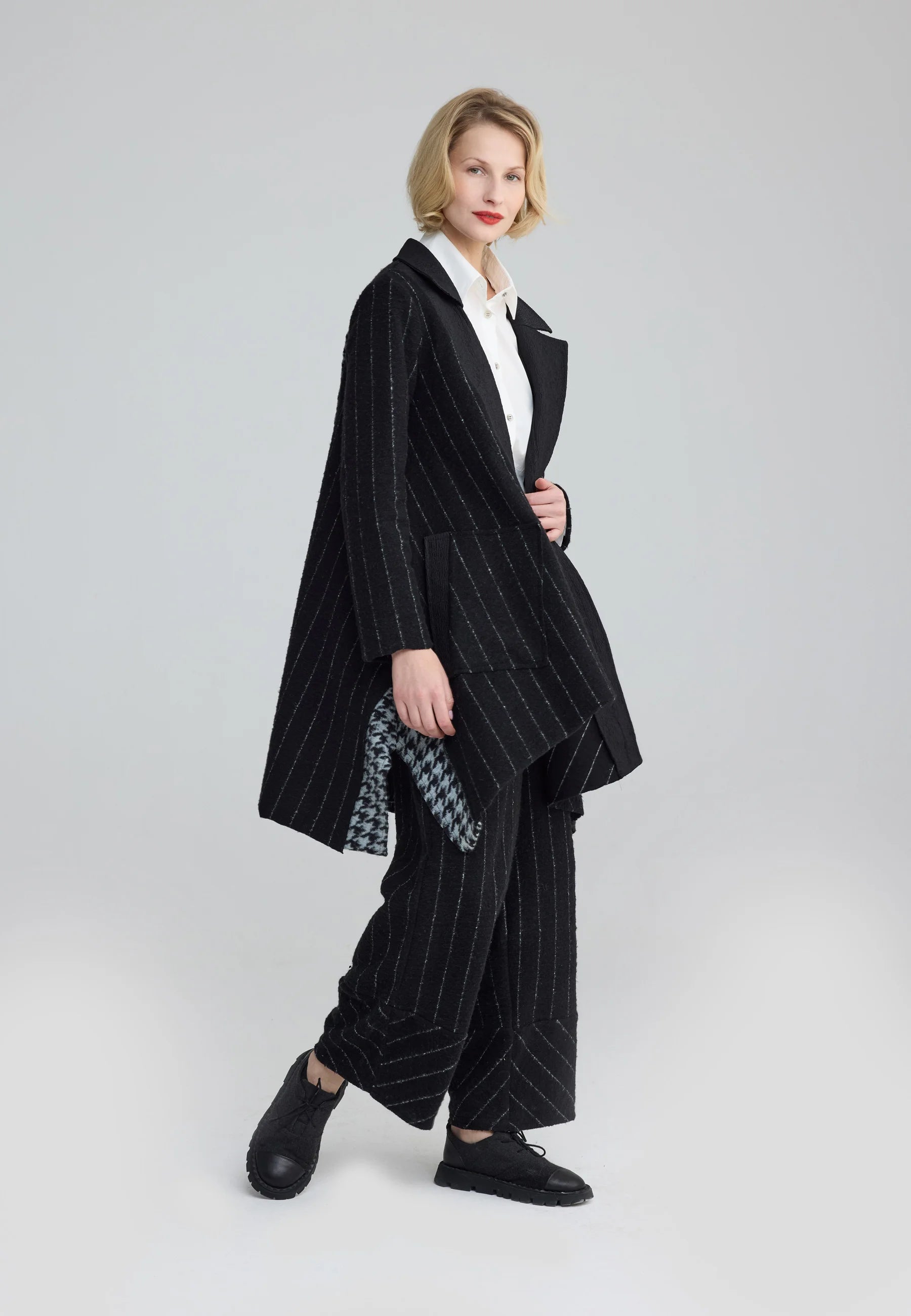 ✓ A long jacket with a dramatic asymmetric hem and a beautiful "A" silhouette that widens towards the bottom.