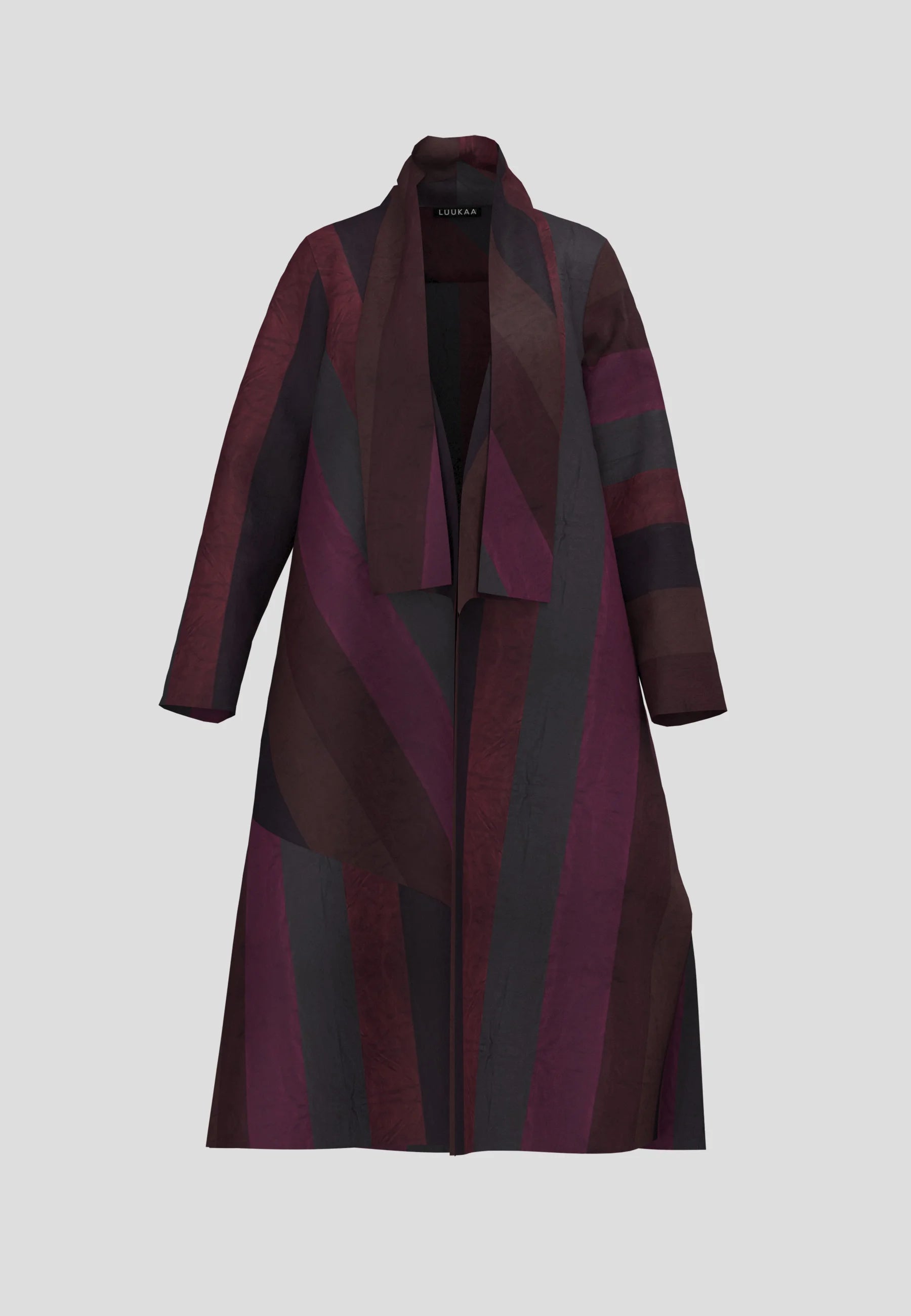 ✓ A long, dramatic duster crafted from memory taffeta with a bold mixed striped pattern, making it a powerful statement piece.