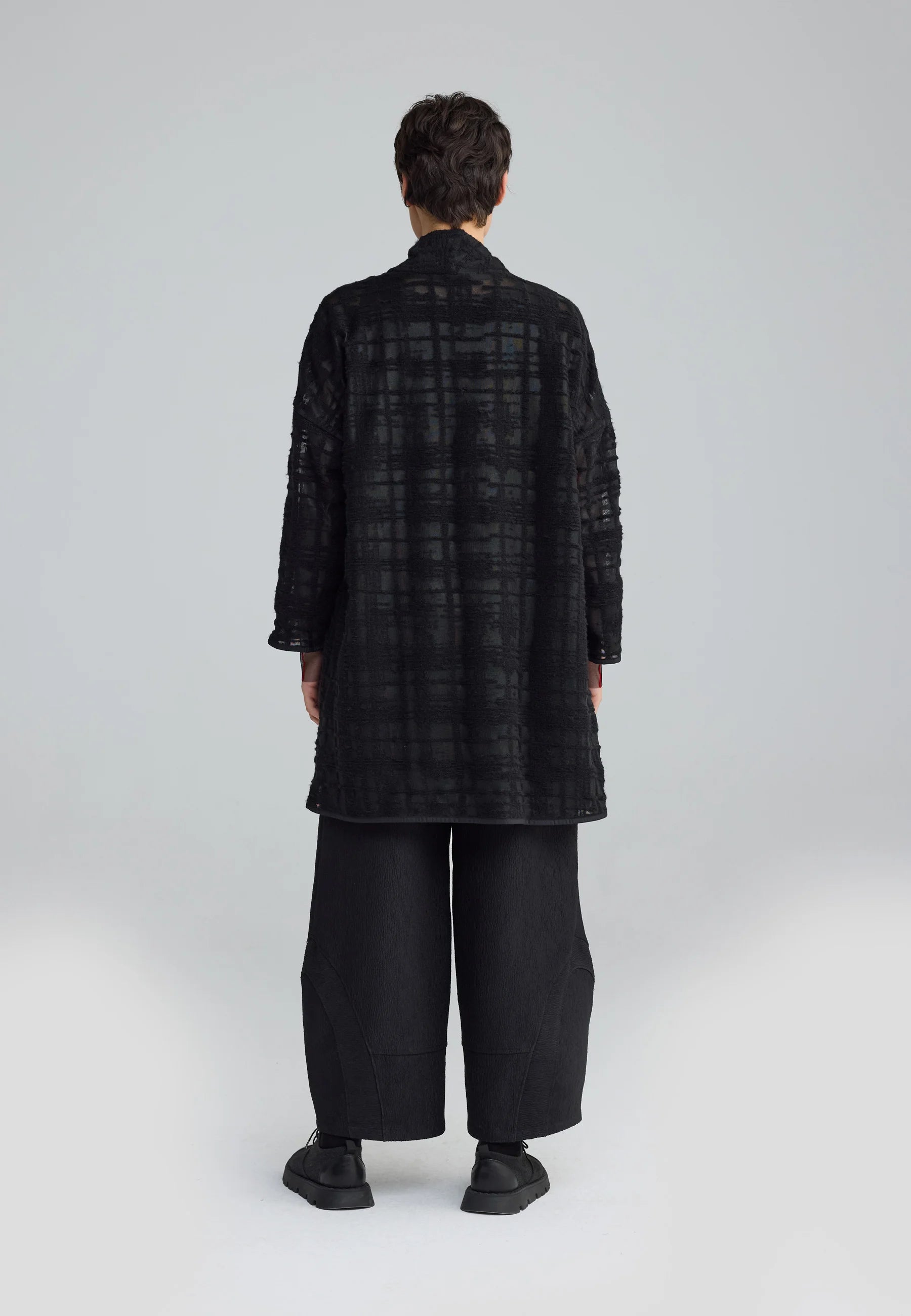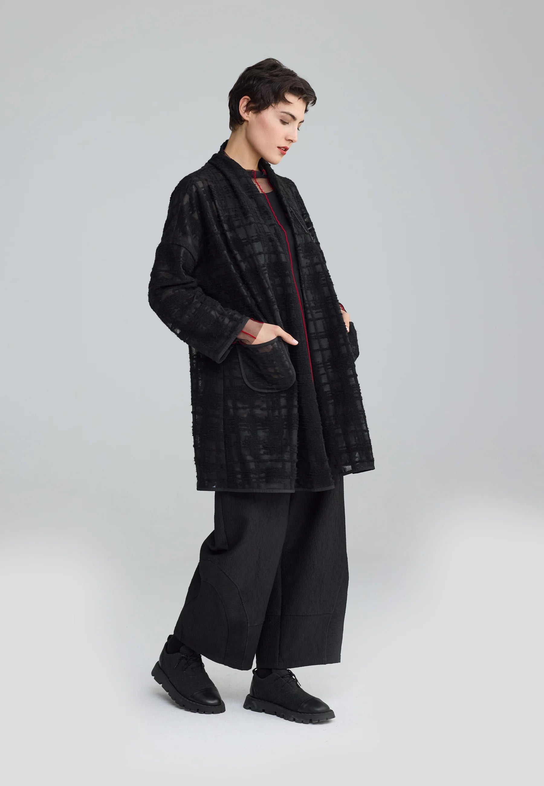 ✓ A long, statement jacket with a distinct "T" silhouette that adds a dramatic, flowing line to any look.