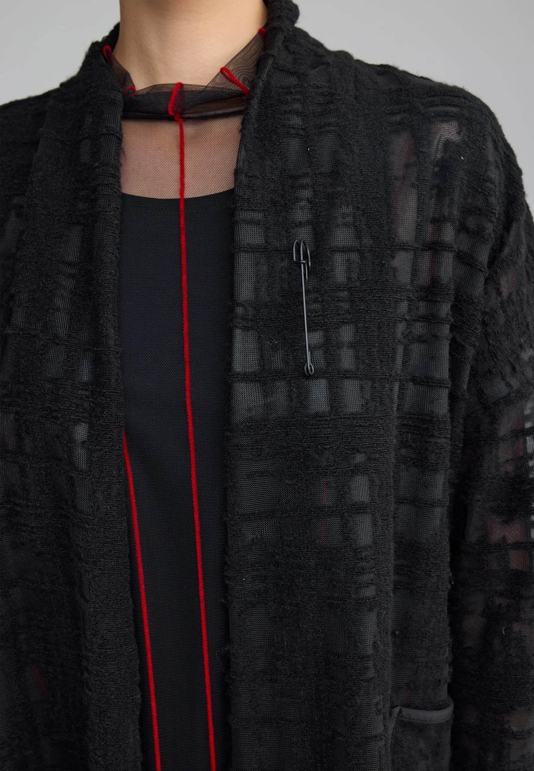 For an effortlessly chic and dimensional outfit, wear it open over the sheer NOELLE Striped mesh layered blouse.