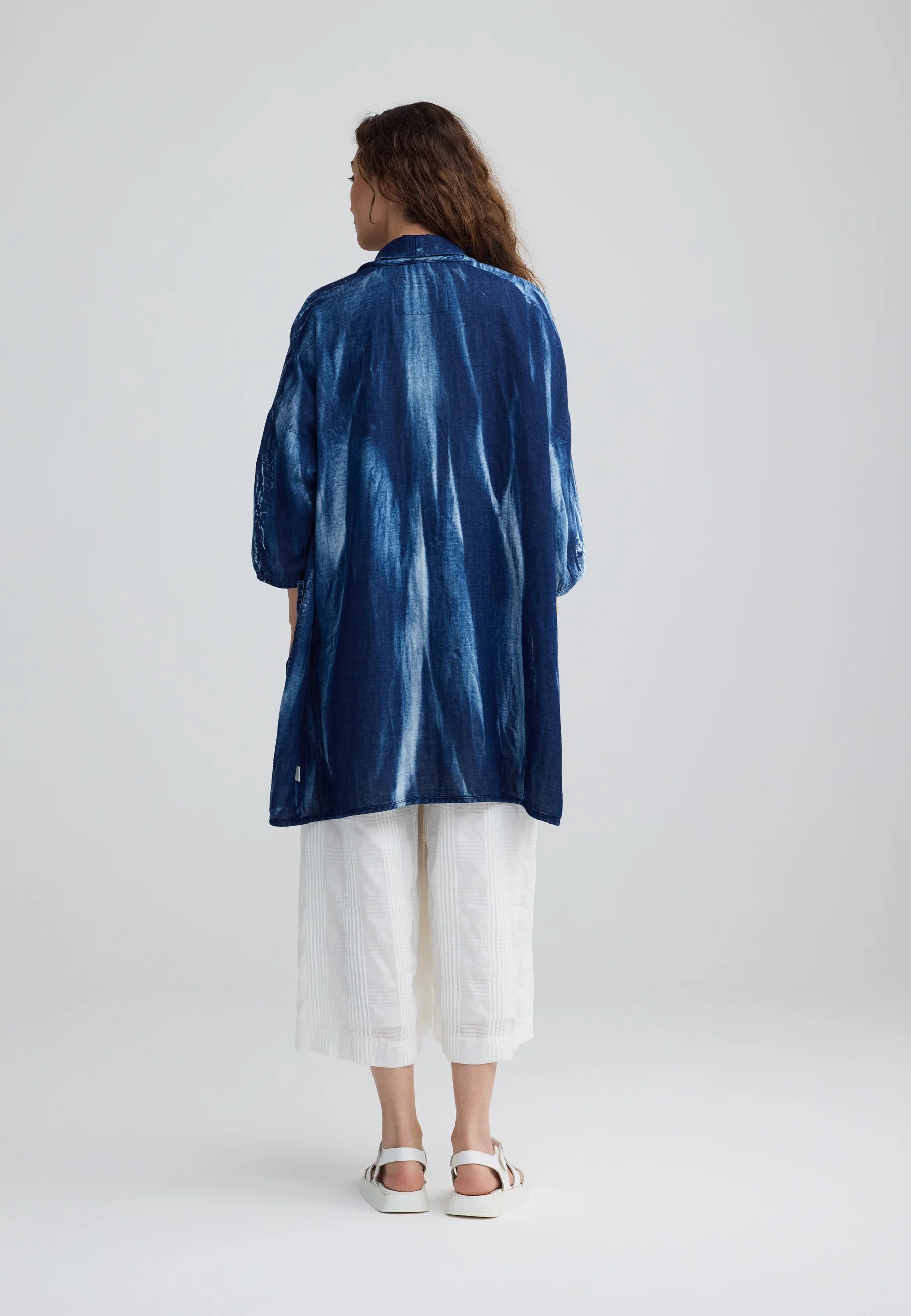 For a high-concept ensemble, wear it open over the AUREA Mixed-Texture Tunic and matching SKYLAR Batik-Effect Wide-Leg Pants to showcase the full "Candy Sky" batik wash.