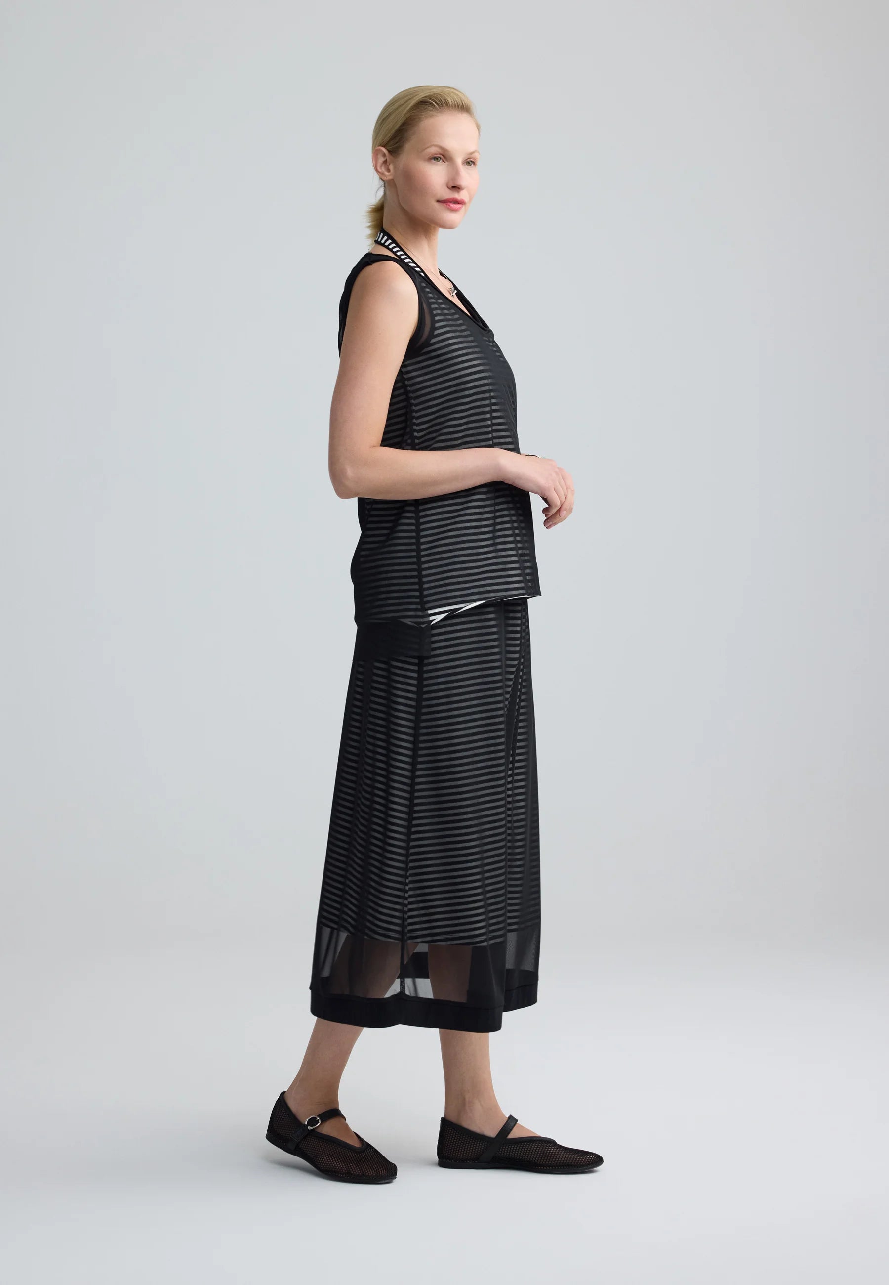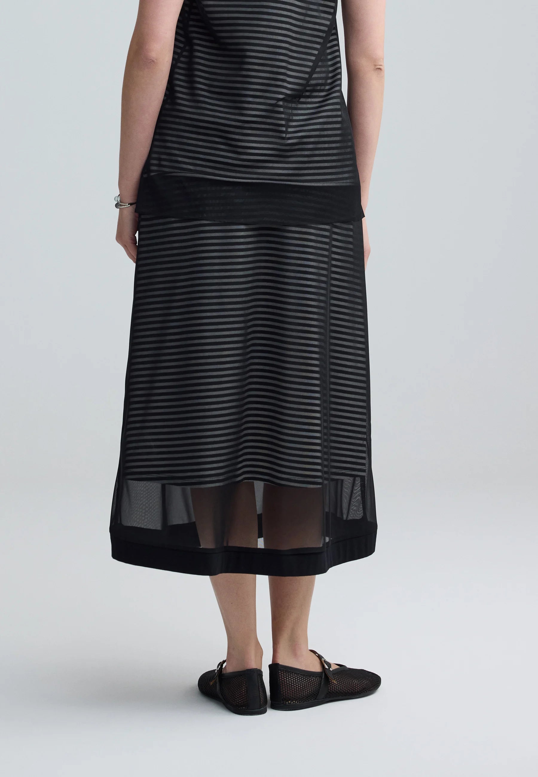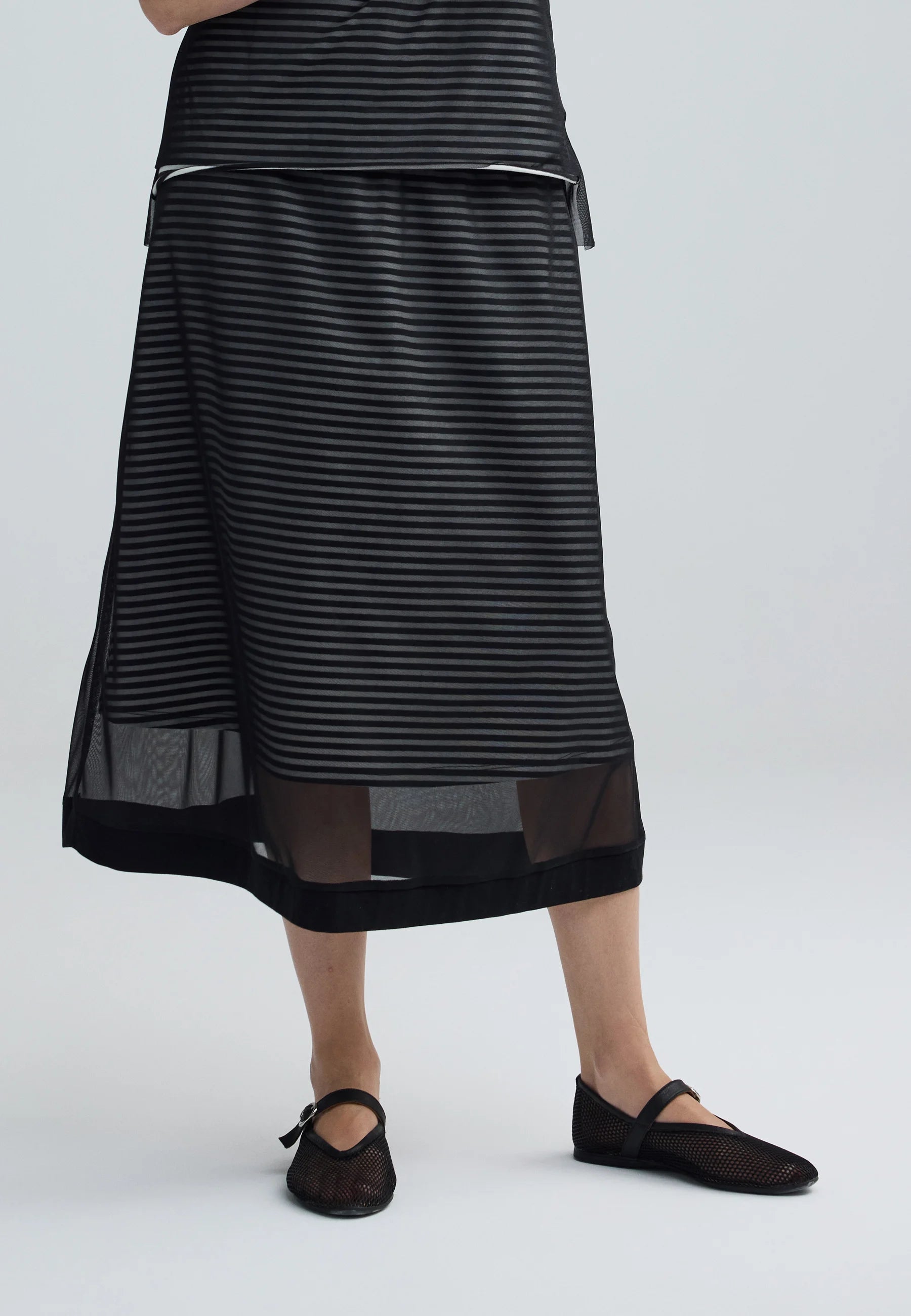 The SAPHINA Striped Mesh Midi Skirt is a masterclass in sophisticated layering and textural play.
