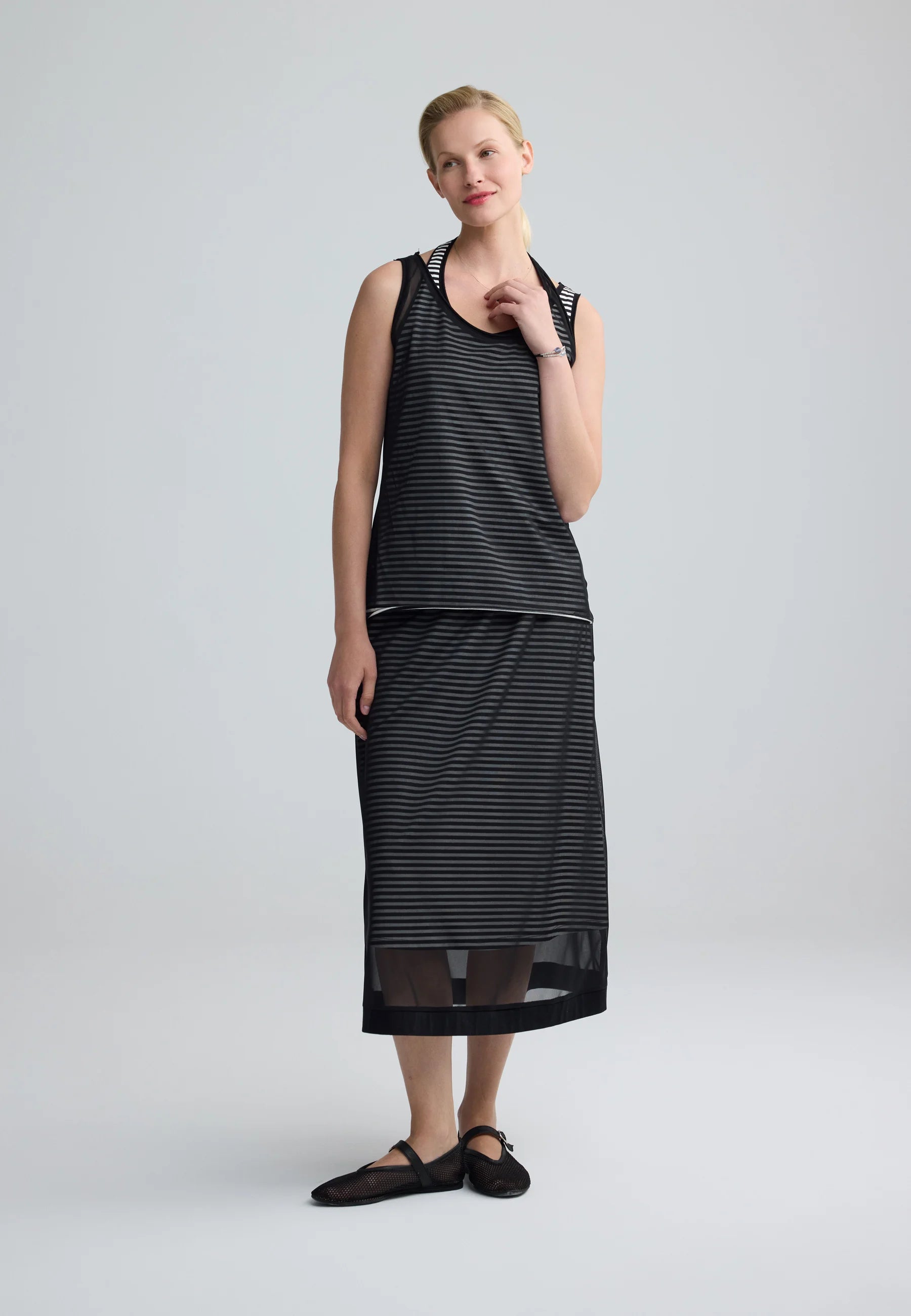 ✓ Sheer mesh outer layer creates a modern play on depth and texture, softening the bold horizontal stripe pattern beneath.