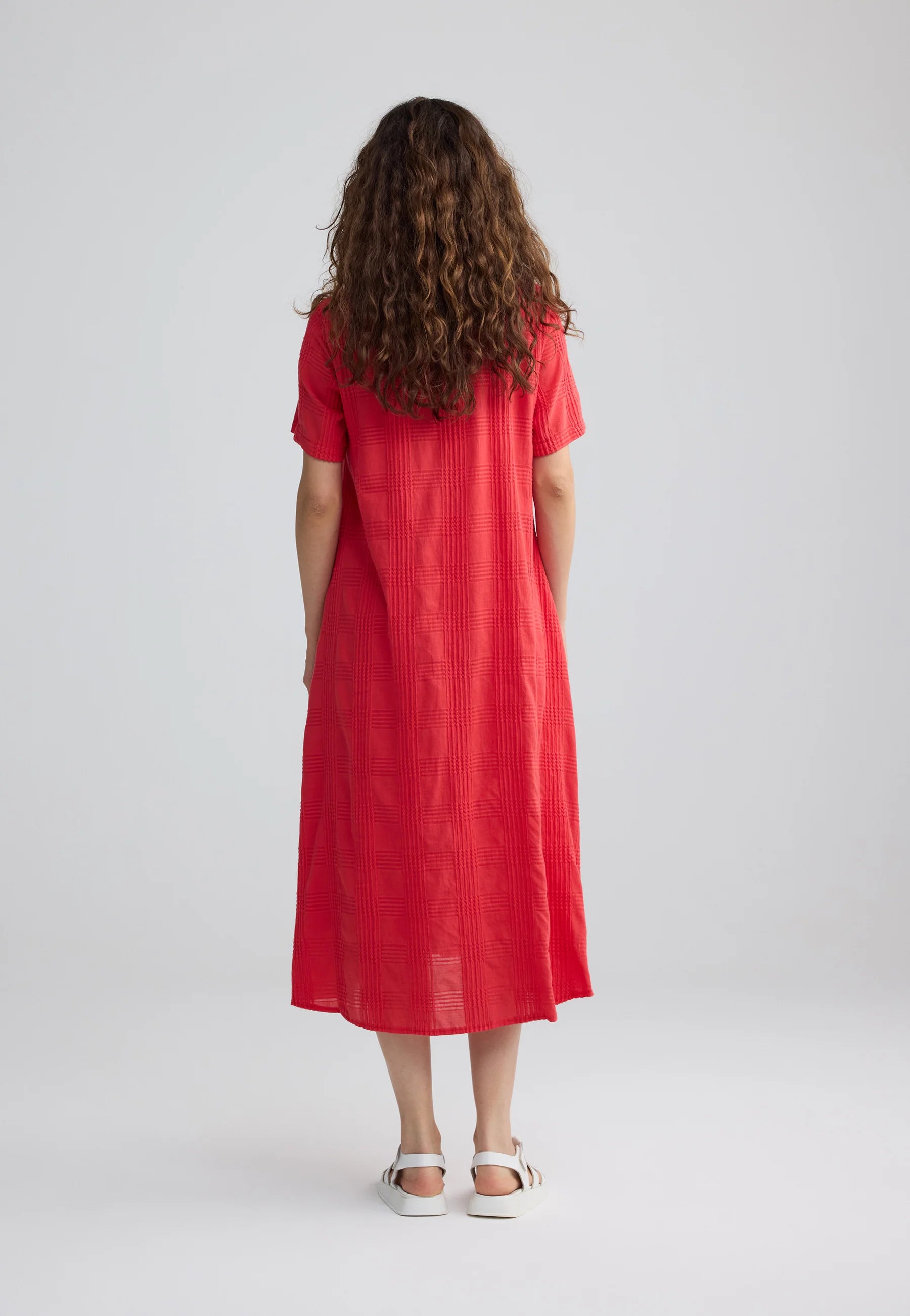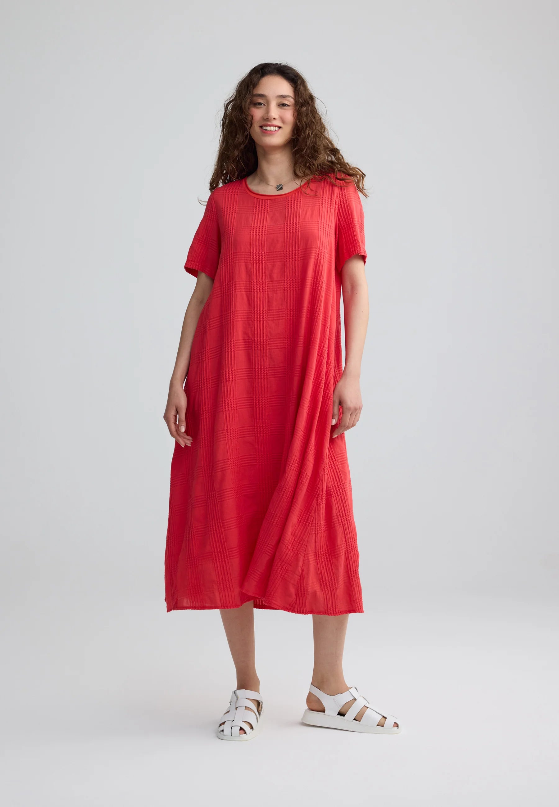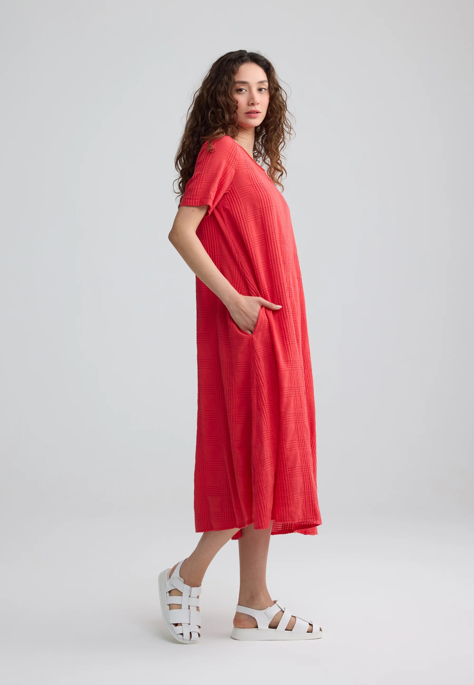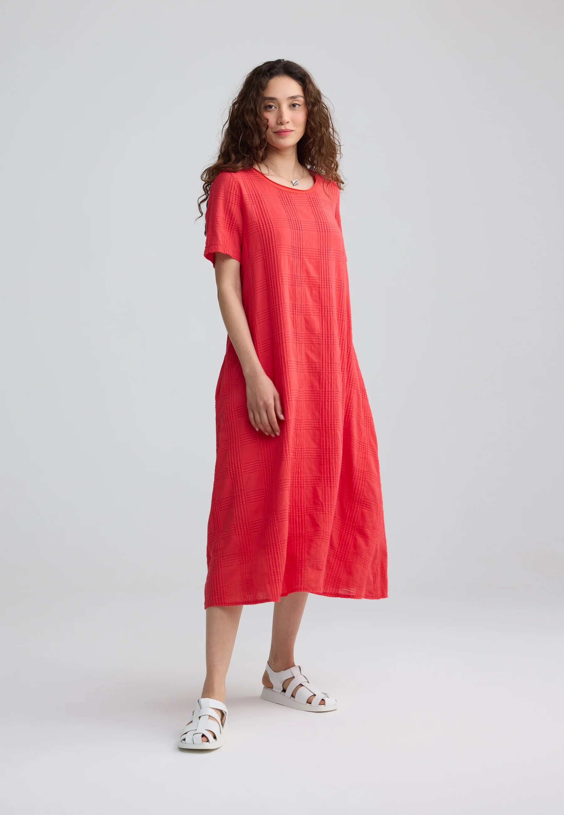 ✓ Mid-calf midi length emphasizes the architectural flow and movement of the textured cotton fabric.