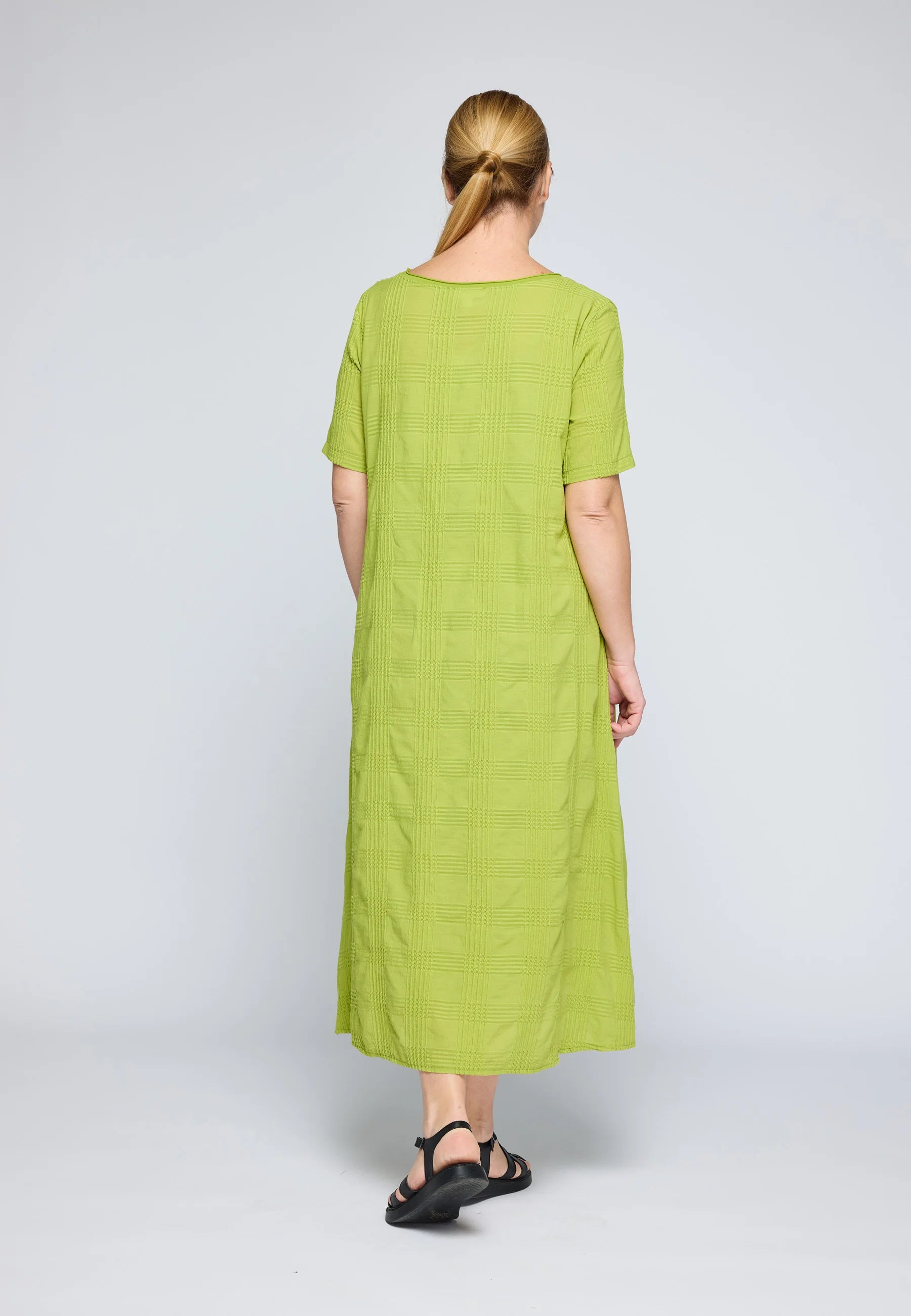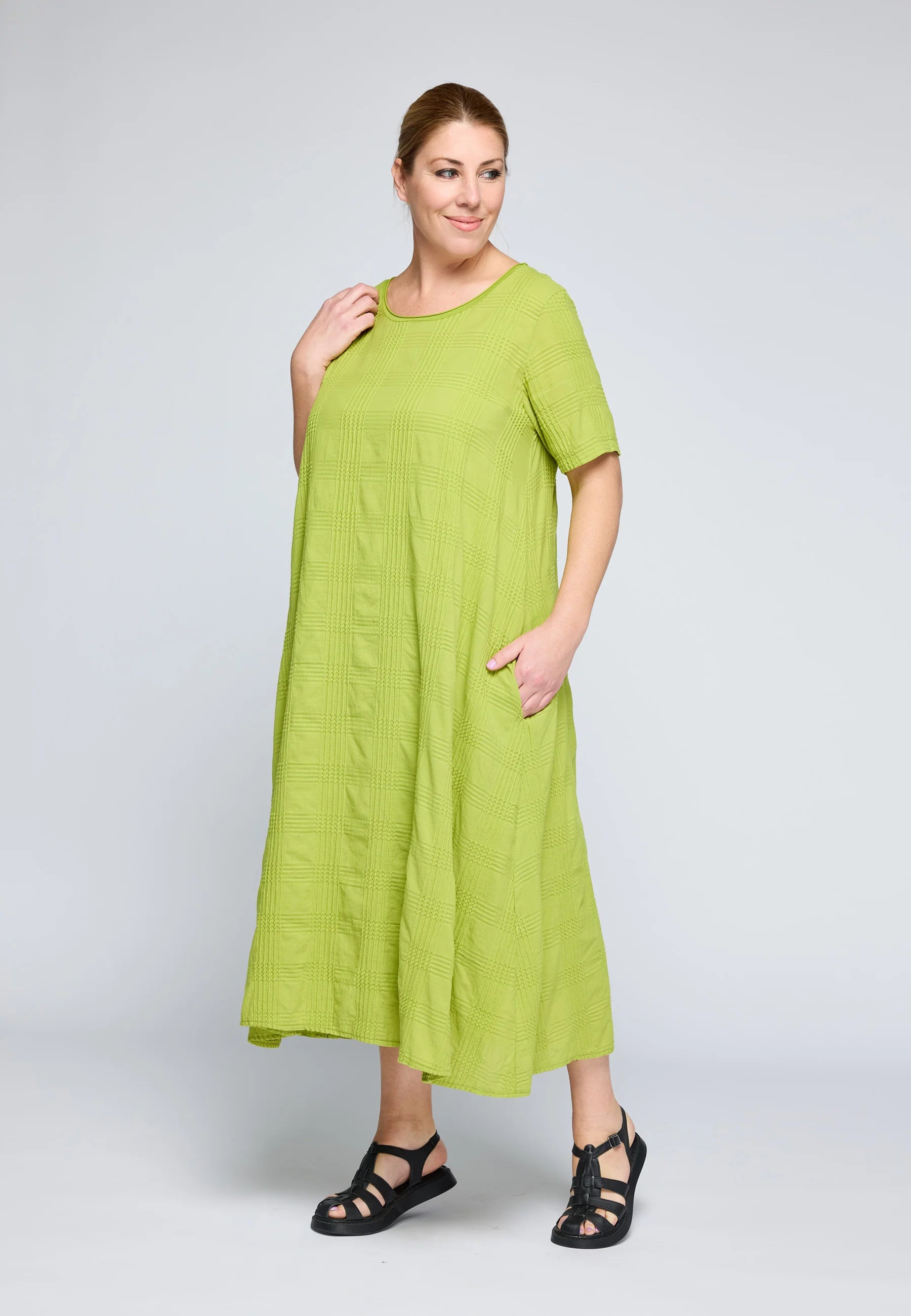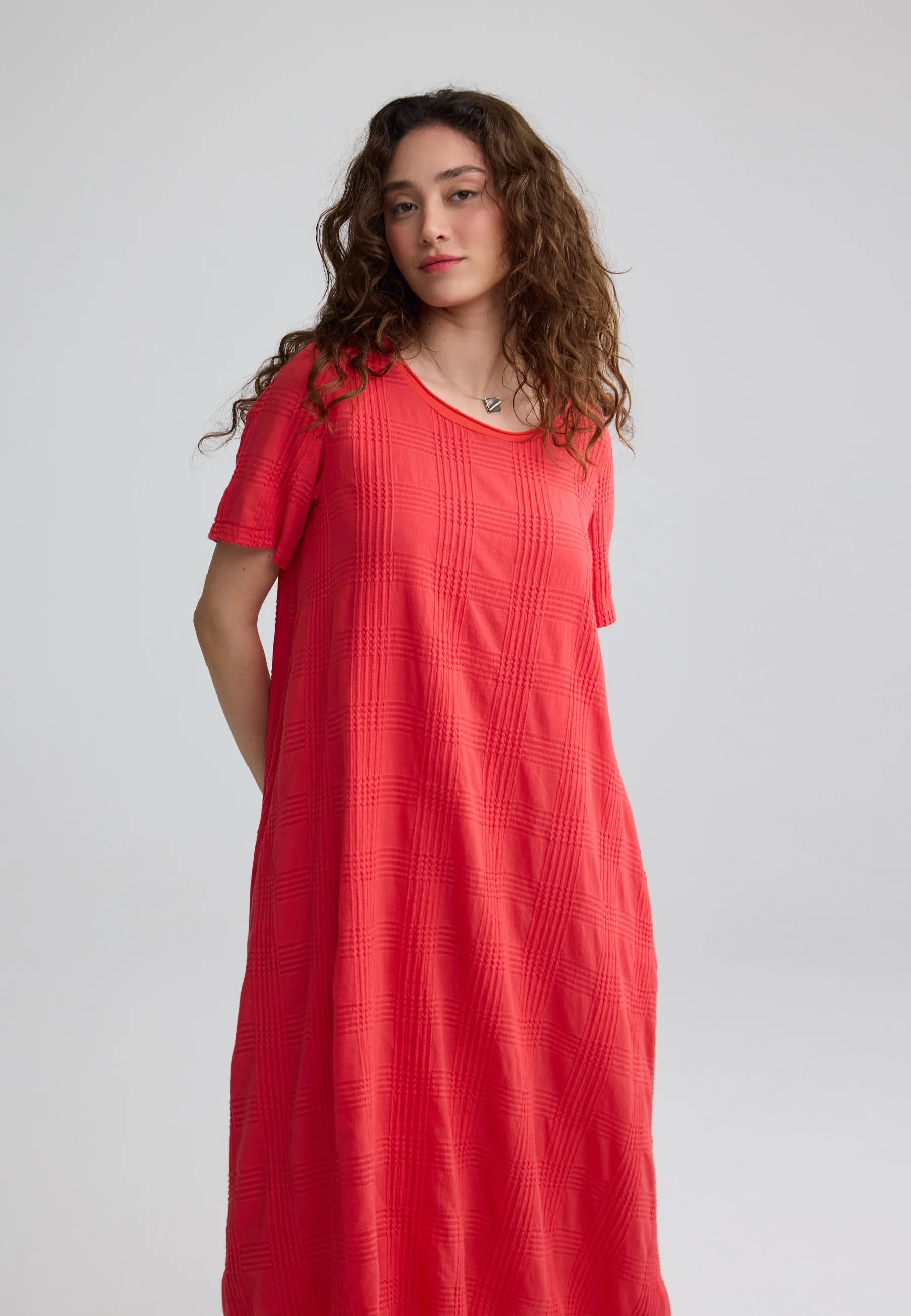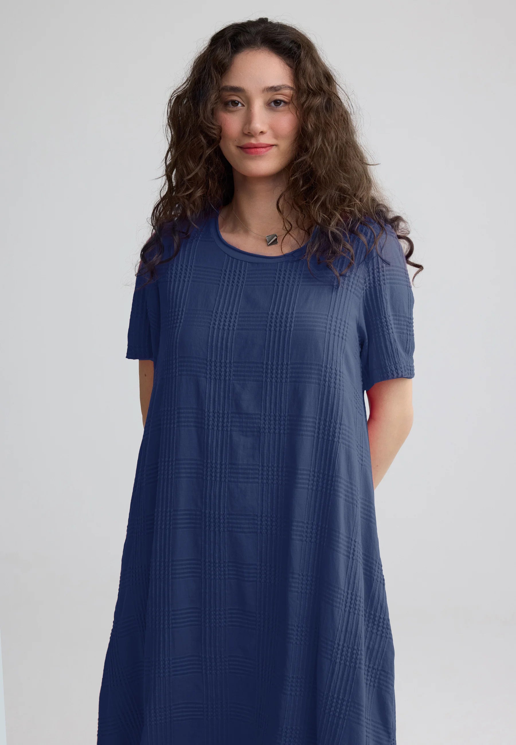 ✓ Mid-calf midi length emphasizes the architectural flow and movement of the textured cotton fabric.