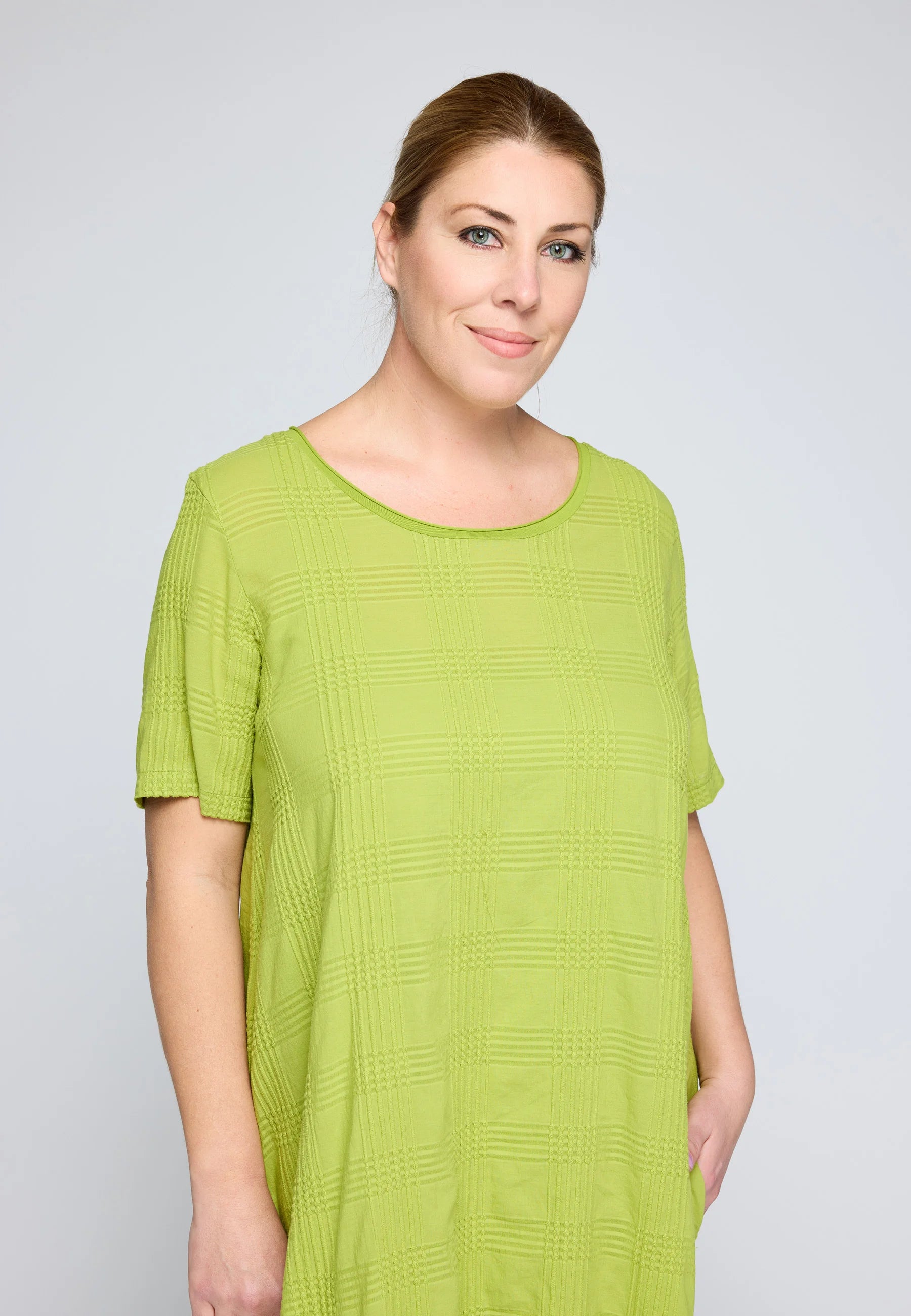 ✓ Designed with a clean, simple round neckline and loose-fitting short sleeves that complement the garment's relaxed aesthetic.