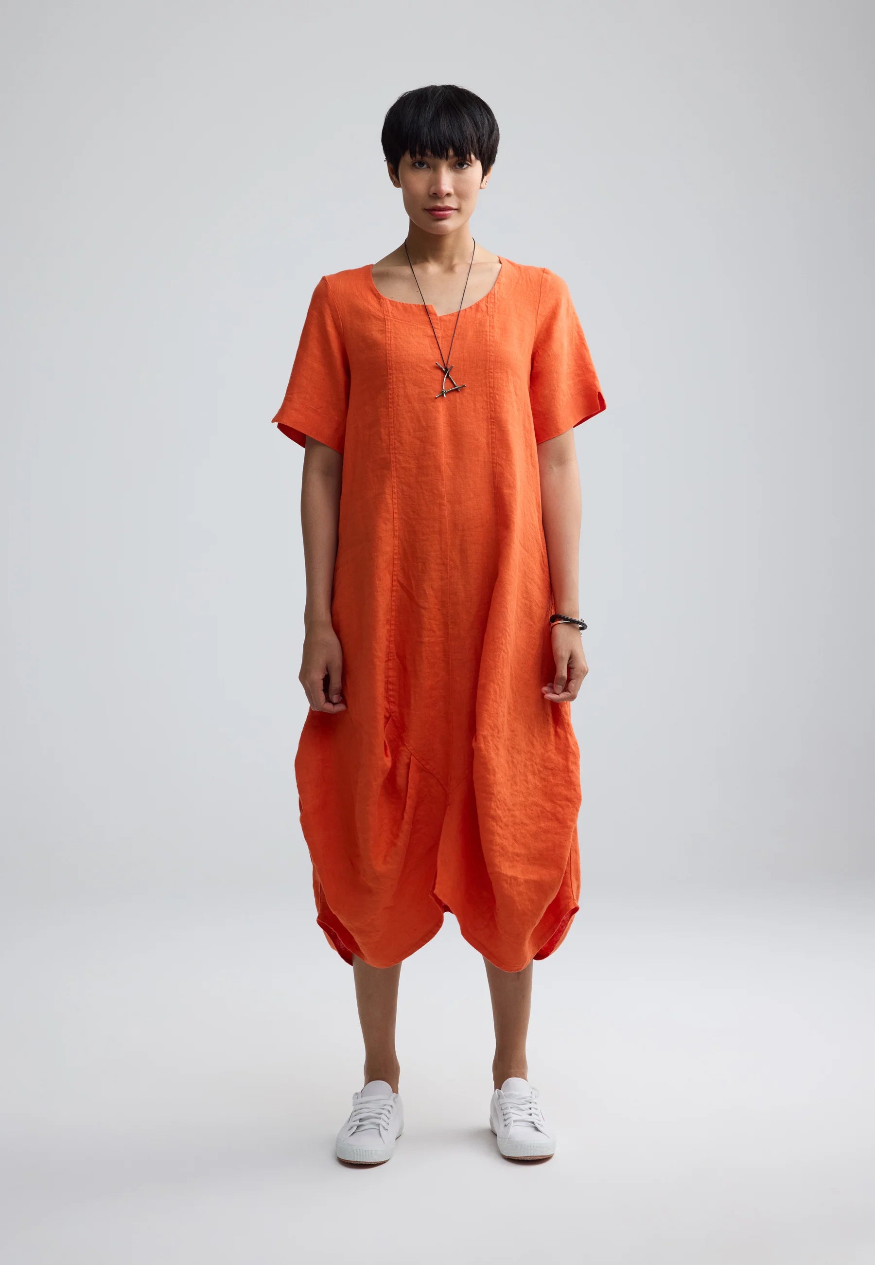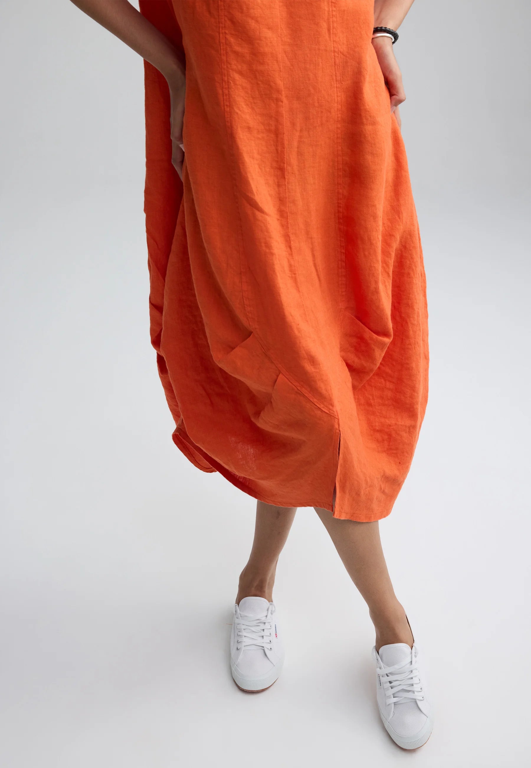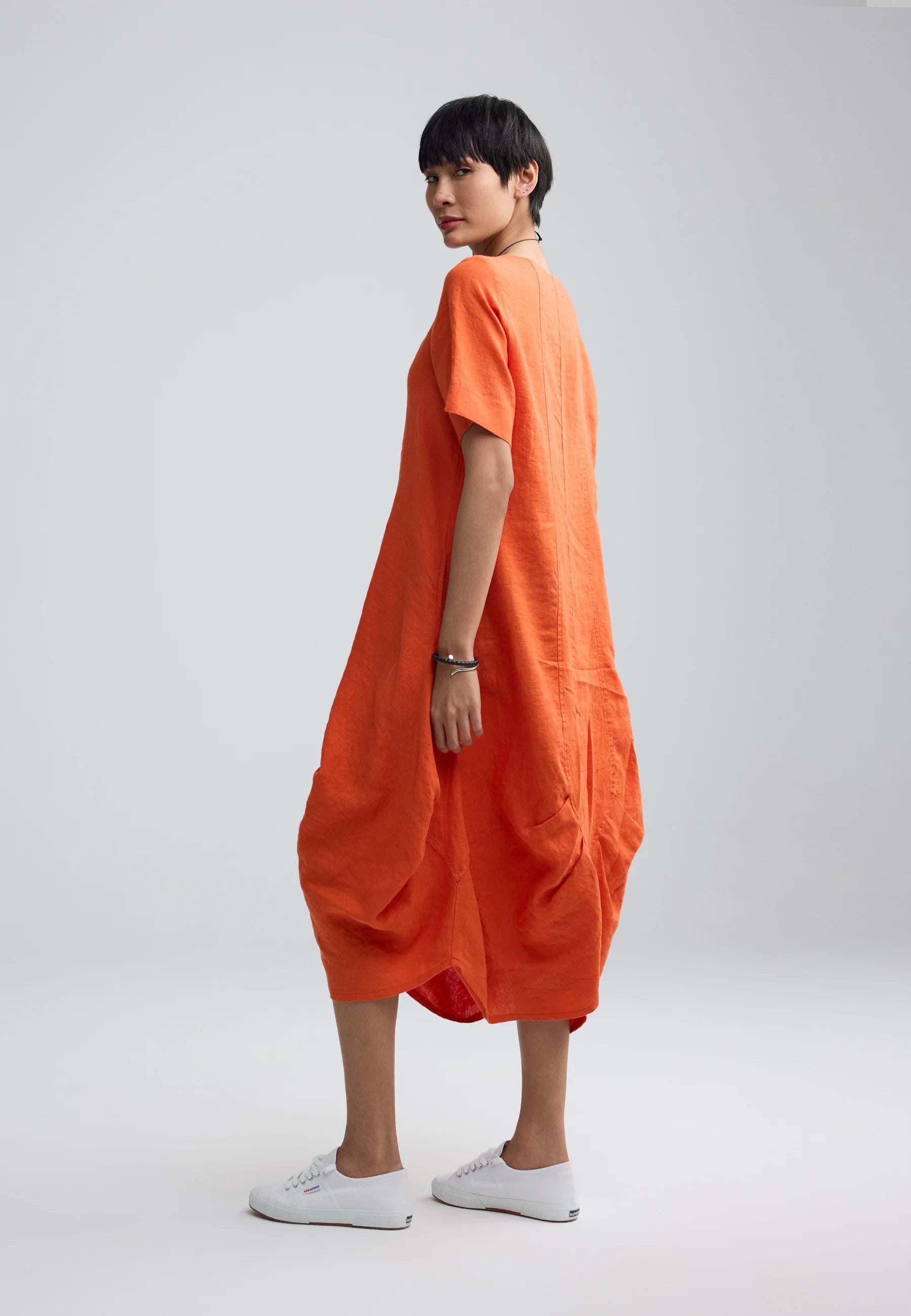 ✓ Midi-length construction ensures the striking volume and structure of the linen remain the primary focal point of the design.