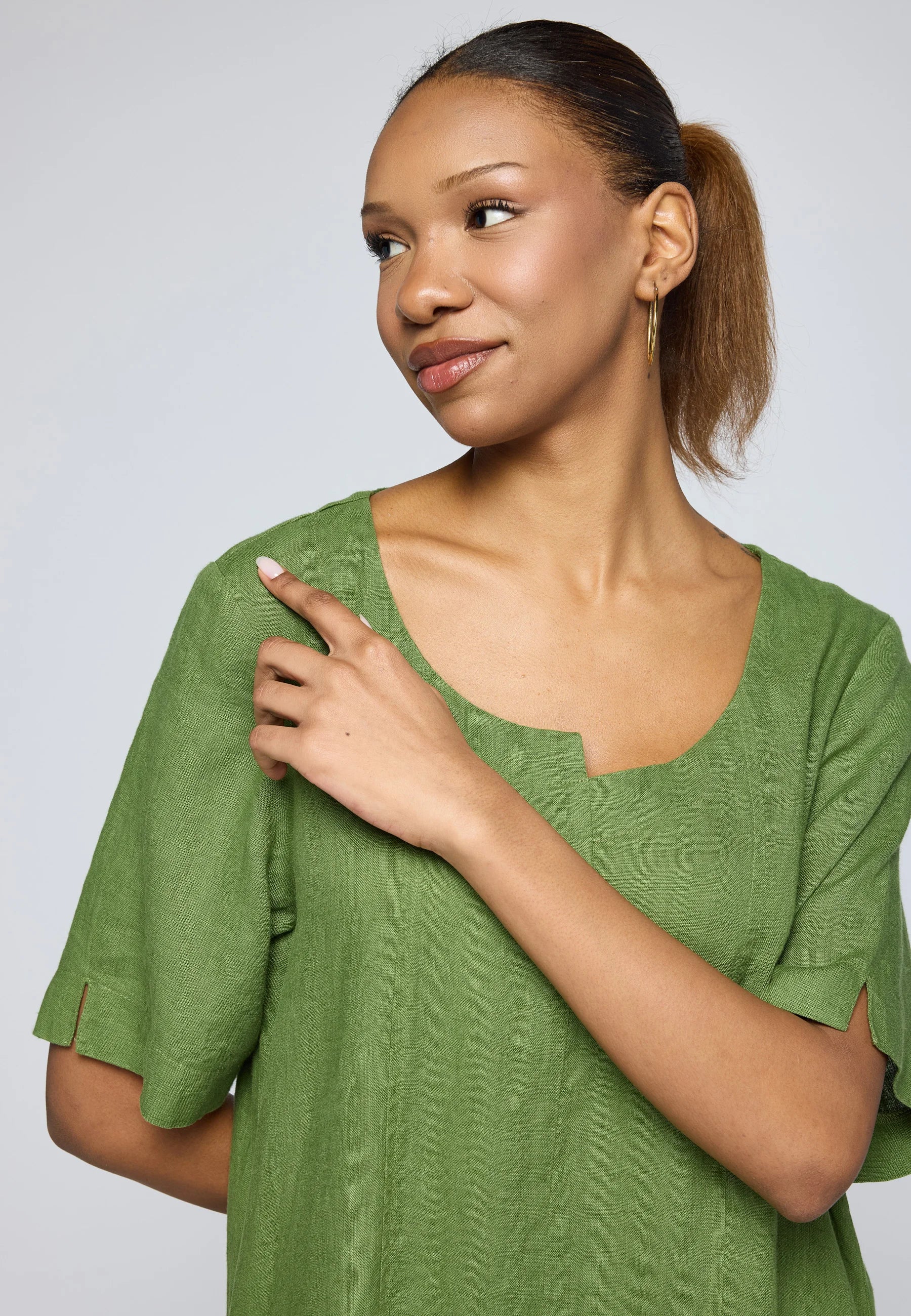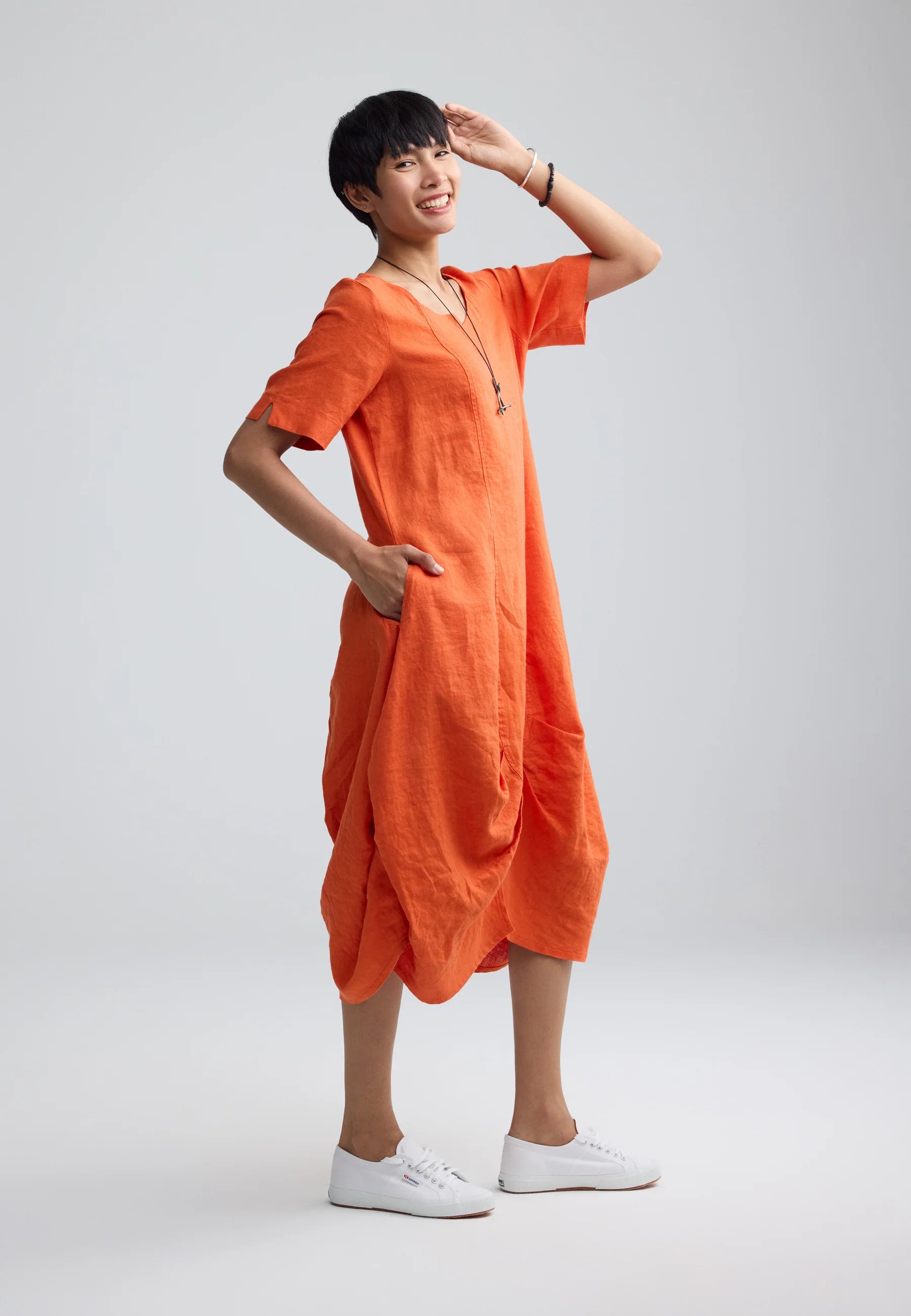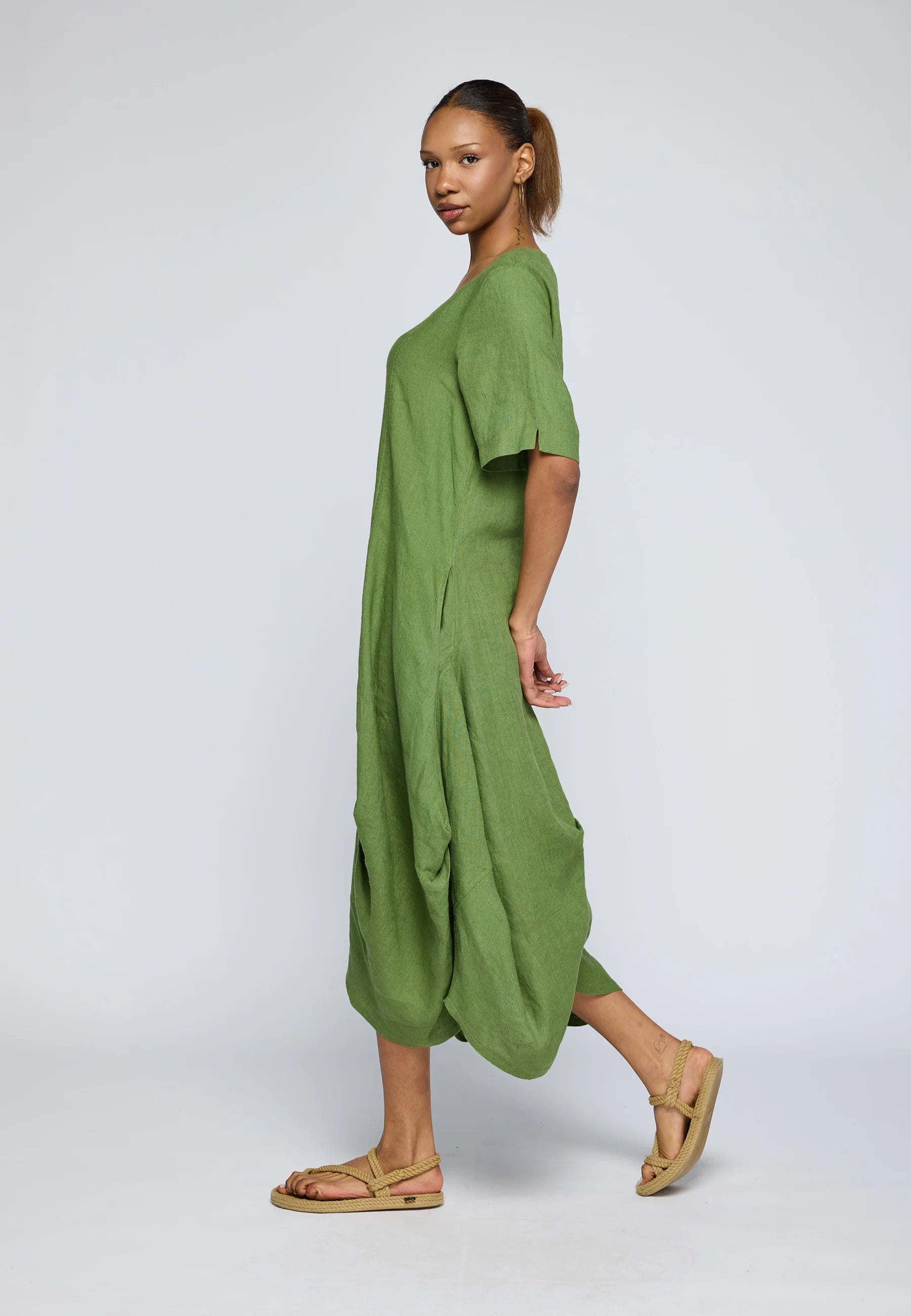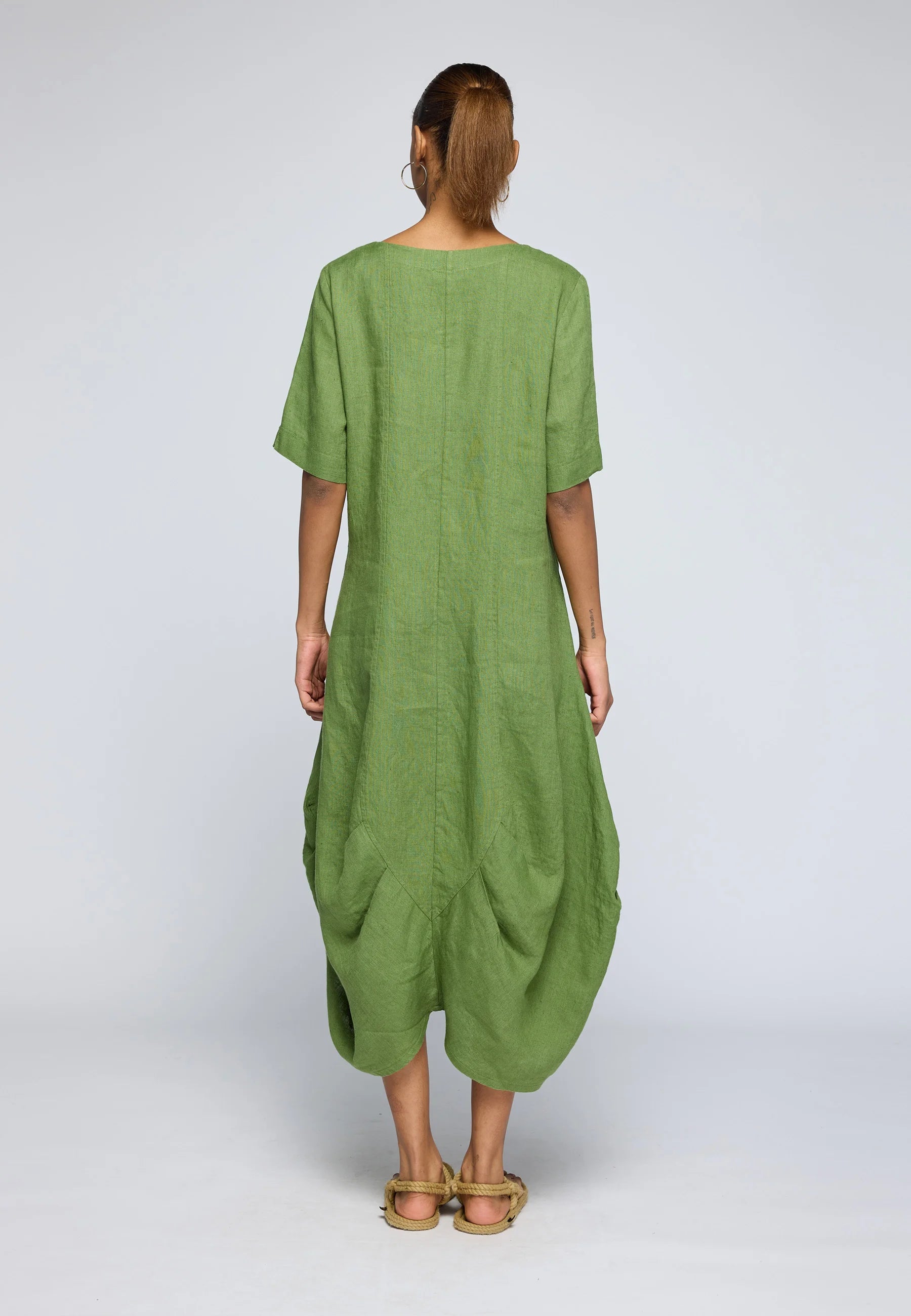 ✓ Midi-length construction ensures the striking volume and structure of the linen remain the primary focal point of the design.